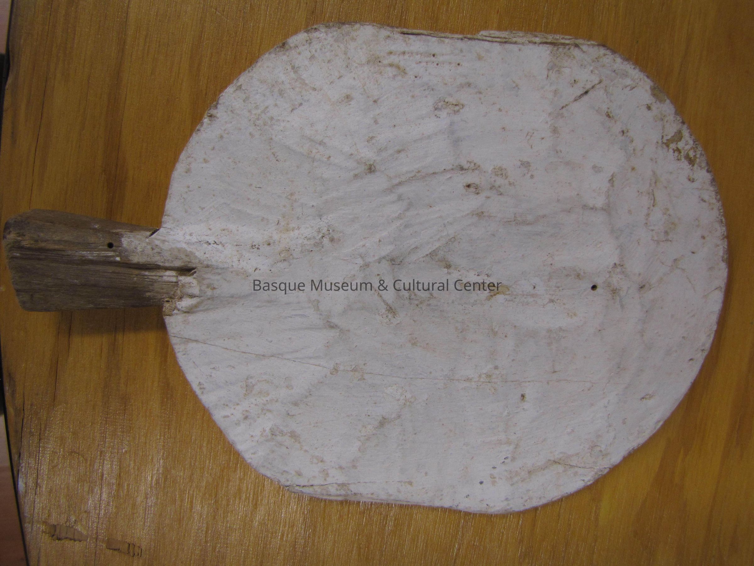 The Paleta was made of wood the traditional way ( using an ax). The paddle is white with a wooden handle. It has writing in black pen on bottom right corner of paddle, giving its background information. See notes for background information.