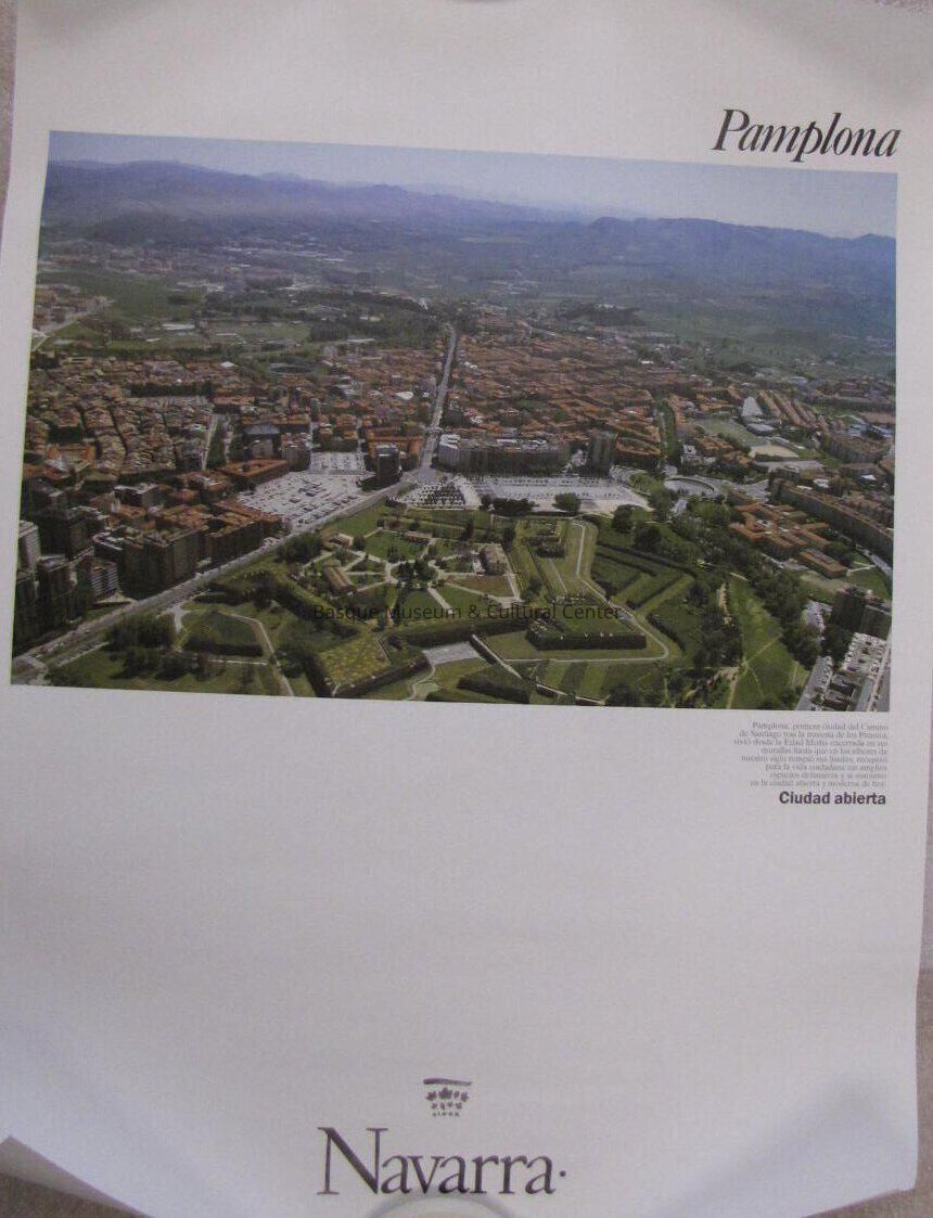 Navarra poster; "Pamplona" heading across the top, right justified; Image of city, photo taken from the sky, red roofs, lots of green trees; Spanish text says "Pamplona, primera ciudad del Camino de Santiago tras la travesia de los Pirineos, vivio desde la Edad Media encerrada en sus murallas hasta que en los albores de nuestro siglo rompio sus limites, recupero para la vida ciudadana sus amplios espacios defensivos y se convirtio en la ciudad abierta y moderna de hoy."; White background.