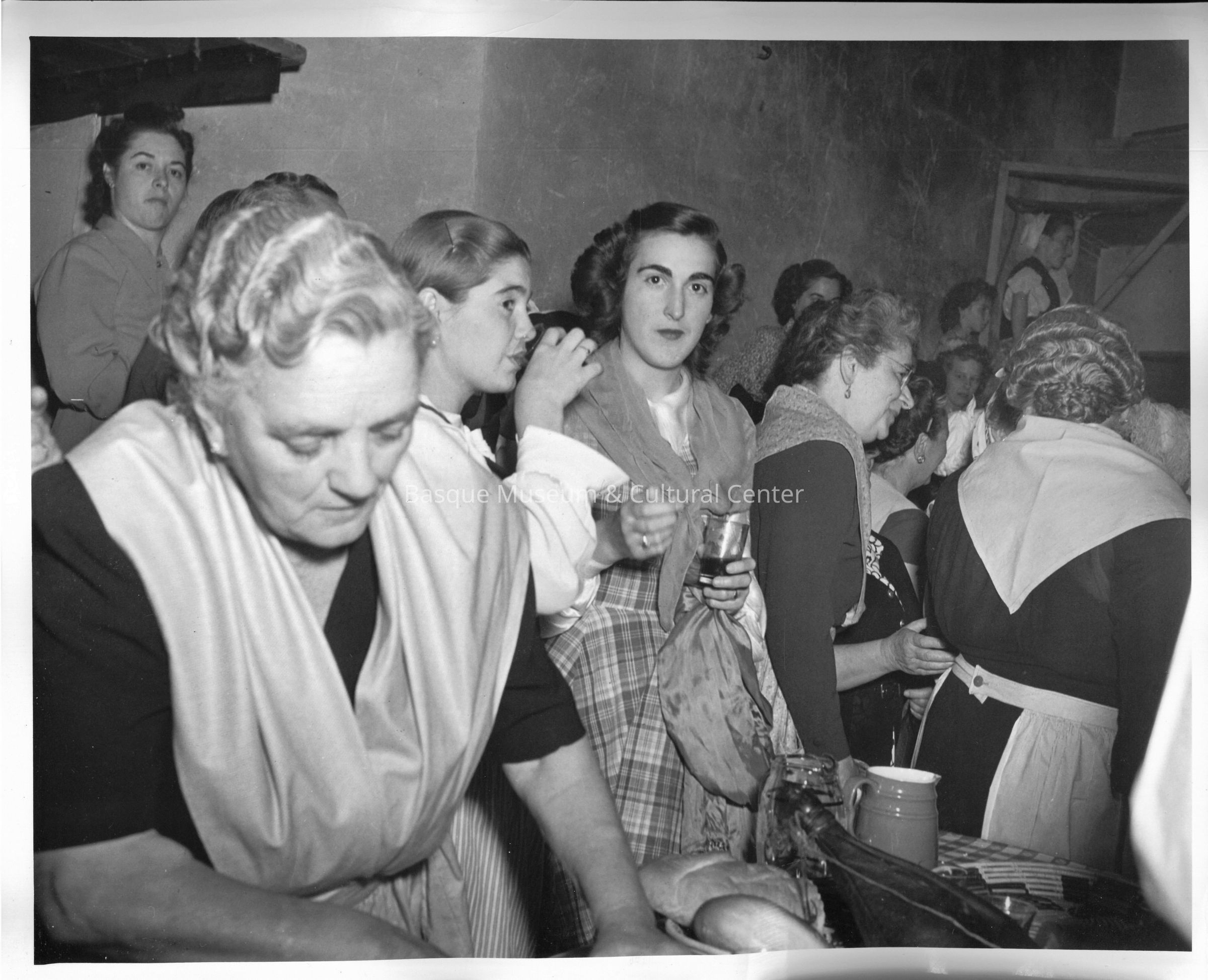 A digital scan of a black and white photoprint: Group of performers getting drinks and waiting back stage during the Song of the Basque performance at Boise's Music Week in 1949.