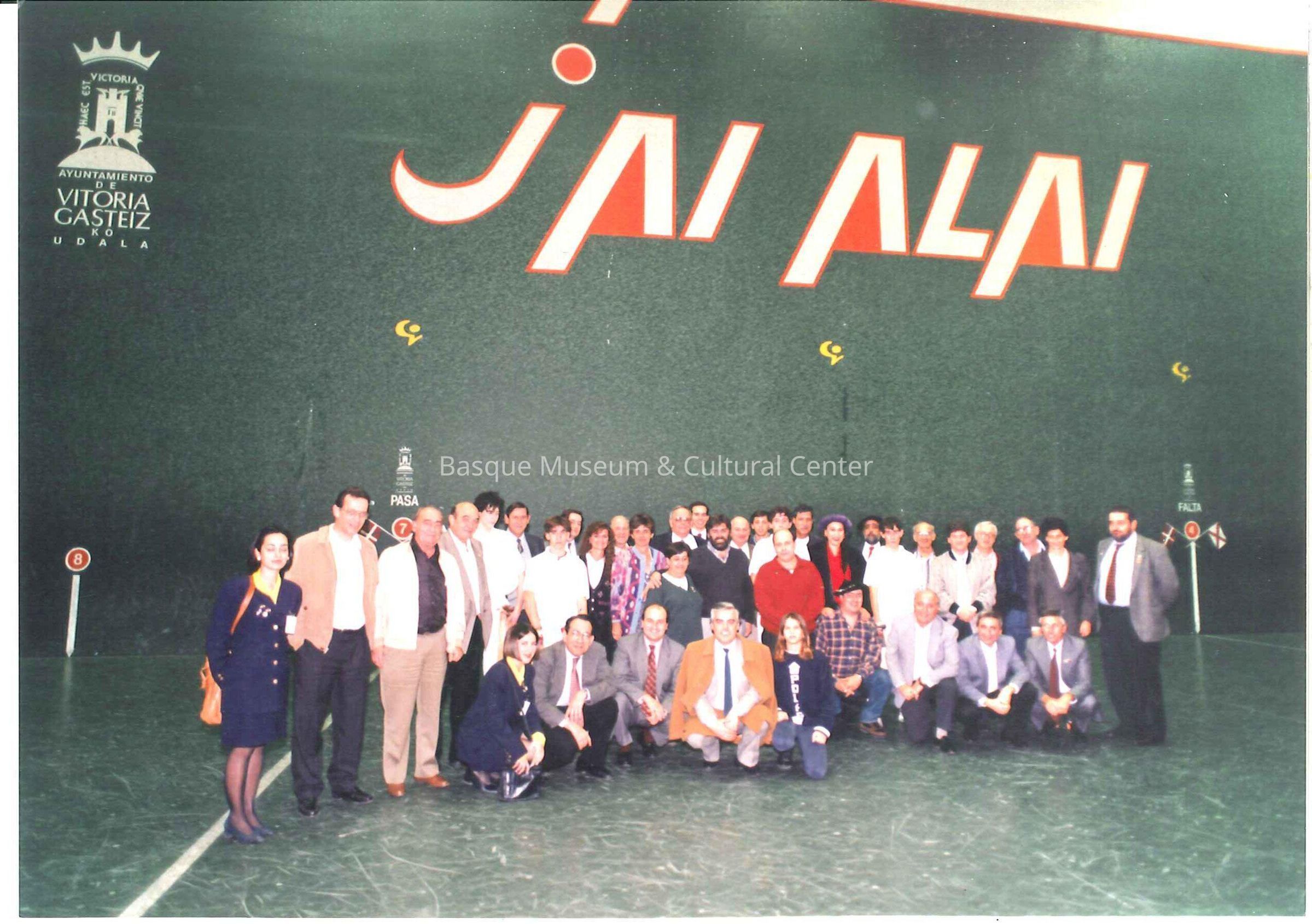 Color photograph; green floor and wall; fronton; inside; large group of people standing; front row kneeling; mostly adults but some younger people; dress is casual to professional; "JAI ALAI" on wall above them; white outlined in orange; upper left corner in white a crown with symbol underneath; "AYUNTAMIENTO DE VITORIA GASTEIZ KO UDALA"; handwritten on back in black "foto: Jon Bernardes" (not very legible)