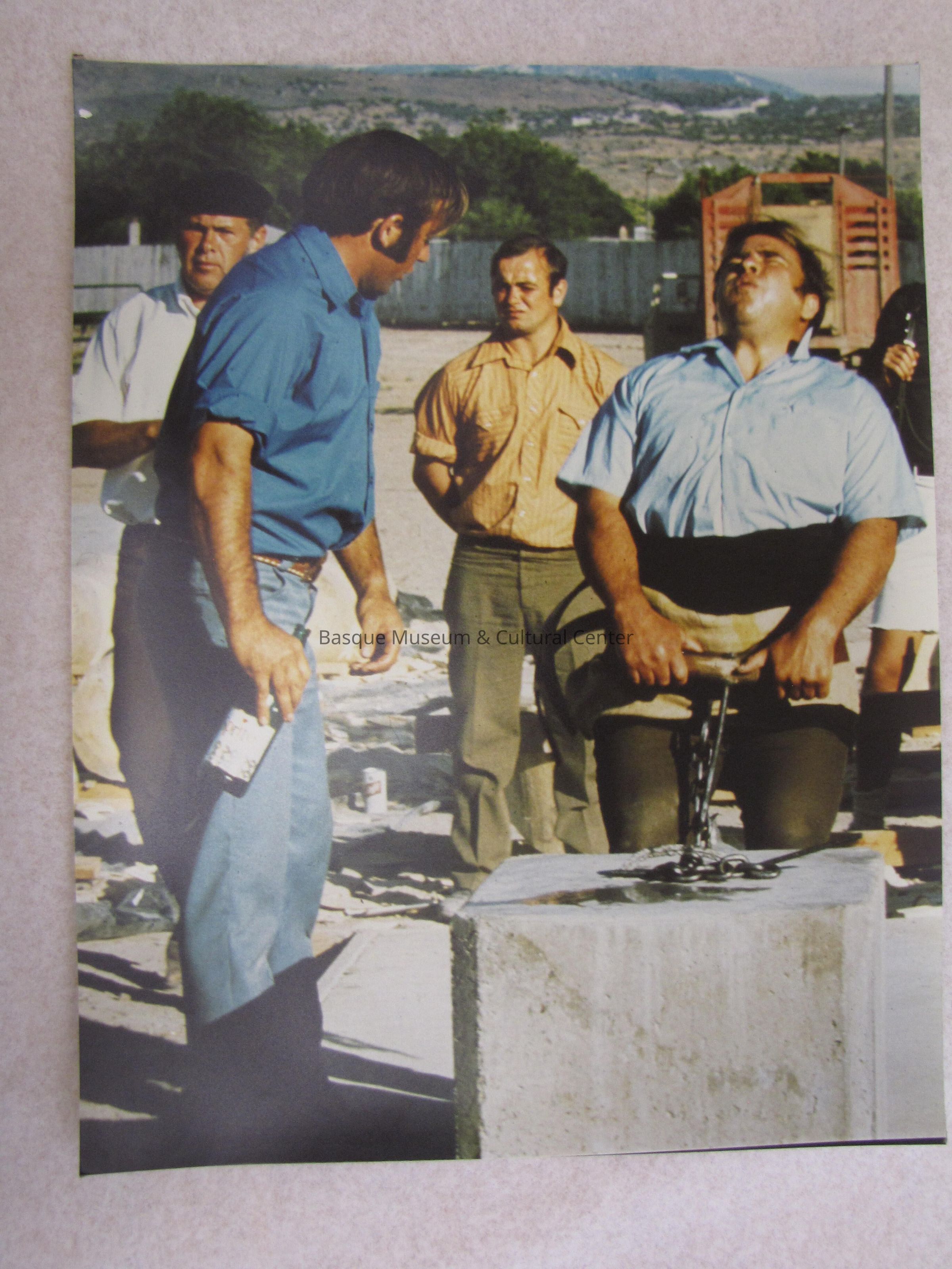 Color photograph; man lifting stone block; block attached to chain and wooden handle; 4 men in picture; weightlifter is wearing blue short sleaved collard shirt with black and white sash around waist; green pants; head back; man standing next to weightlifter is talking to him; holding sprite glass bottle; blue collard shirts and blue jeans; outside; daylight; back has clear plastic tape on edges; "48" in red in upper left corner; "0 23" in pencil upper right corner