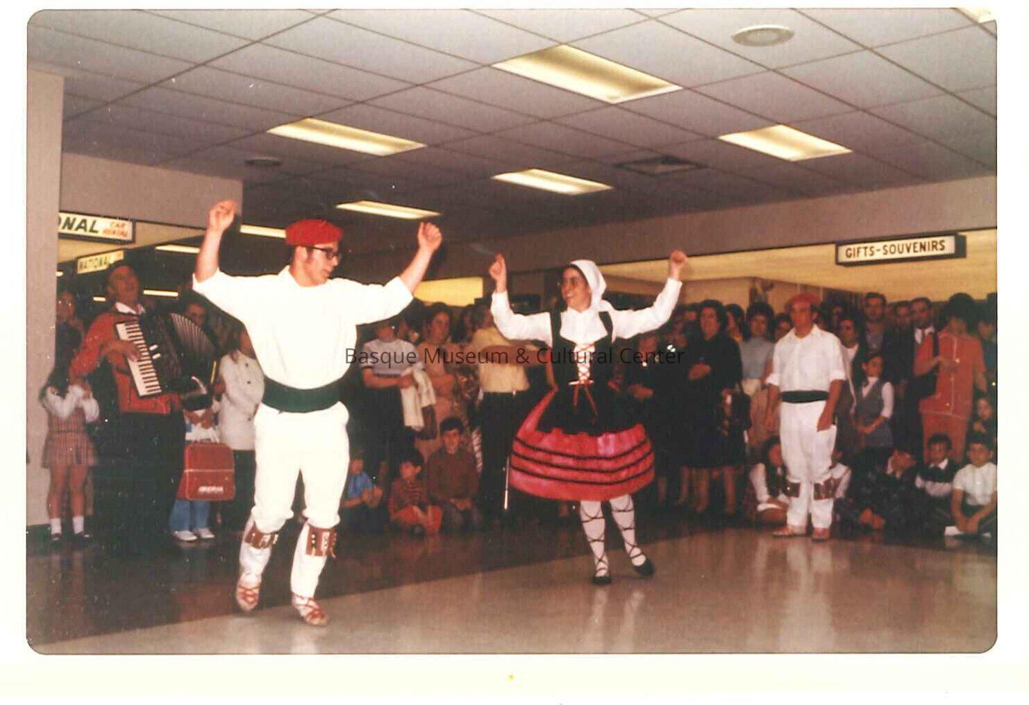 April 5, 1972 Oinkari Dancers at the Boise airport performing for Basque guests from Spain. Main male dancer is Chris Bieter.