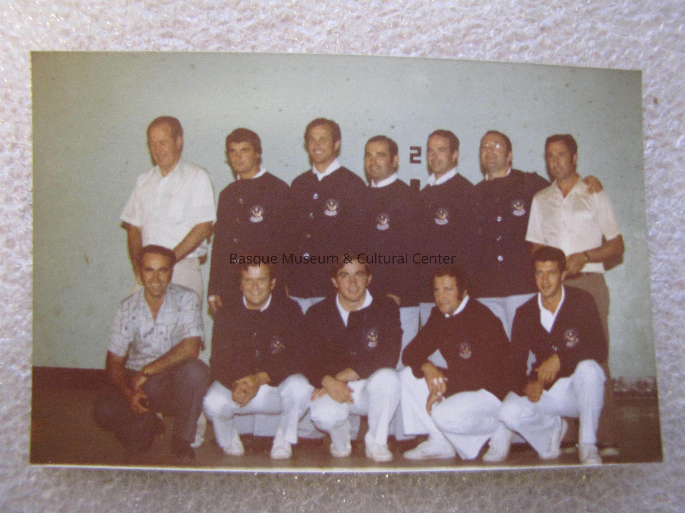 1 color photo of 12 men posing for a picture. There are 7 men standing, and 5 men kneeling down. Starting from left in back row, John Bastida is dressed in white collard shirt, and white pants, next 5 men are wearing a navy blue blazer, white collard shirt, and grey pants. Man on far right in top row, is Jose Ramon Legarreta wearing a cream collared shirt, and kaki pants. Bottom row man on far left is Francois Bidaurreta wearing a blue/black lined collard shirt, and blue jeans. Next 4 men are wearing a navy blue blazer, white collared shirt, white pants, and white shoes. 9 men may be wearing a uniform for Jai Alai, or pelota. All 12 men are possibly in front of a pelota wall.