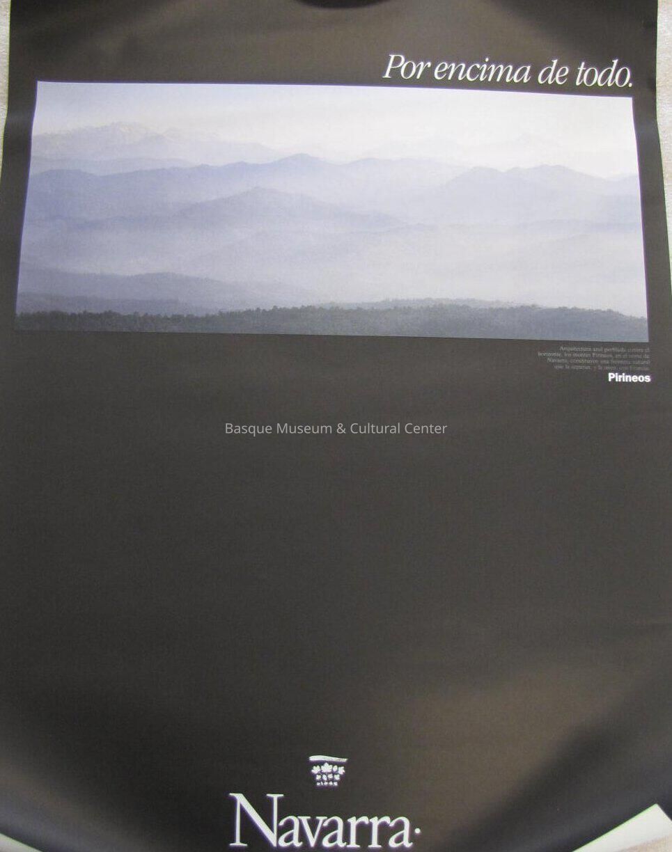 Navarra poster; "Por encima de todo." heading across the top, right justified; Image of misty mountains, purple/grey colors, green trees at bottom of picture, hazy; Spanish text says "Arquitectura azul perfilada contra el horizonte, los montes Pirineos, en el norte de Navarra, constituyen una frontera natural que separan, y la unen, con Francia."; Black background.