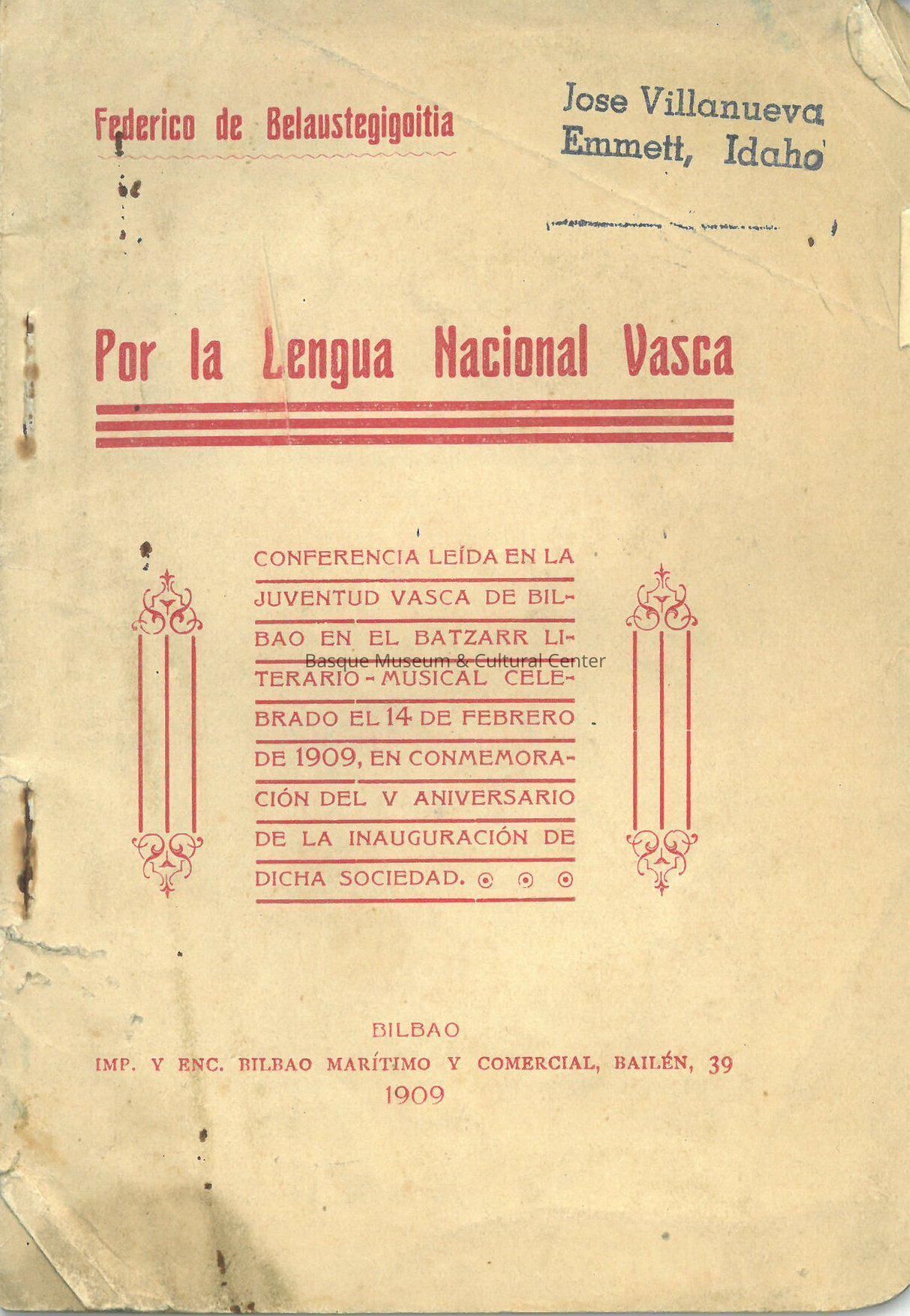 Por la lengua nacional vasca : conferencia lei´da en la Juventud Vasca de Bilbao en el Batzarre Literario-Musical celebrado el 14 de febrero de 1909, en conmemoracio´n del V aniversario de la inauguracio´n de dicha sociedad