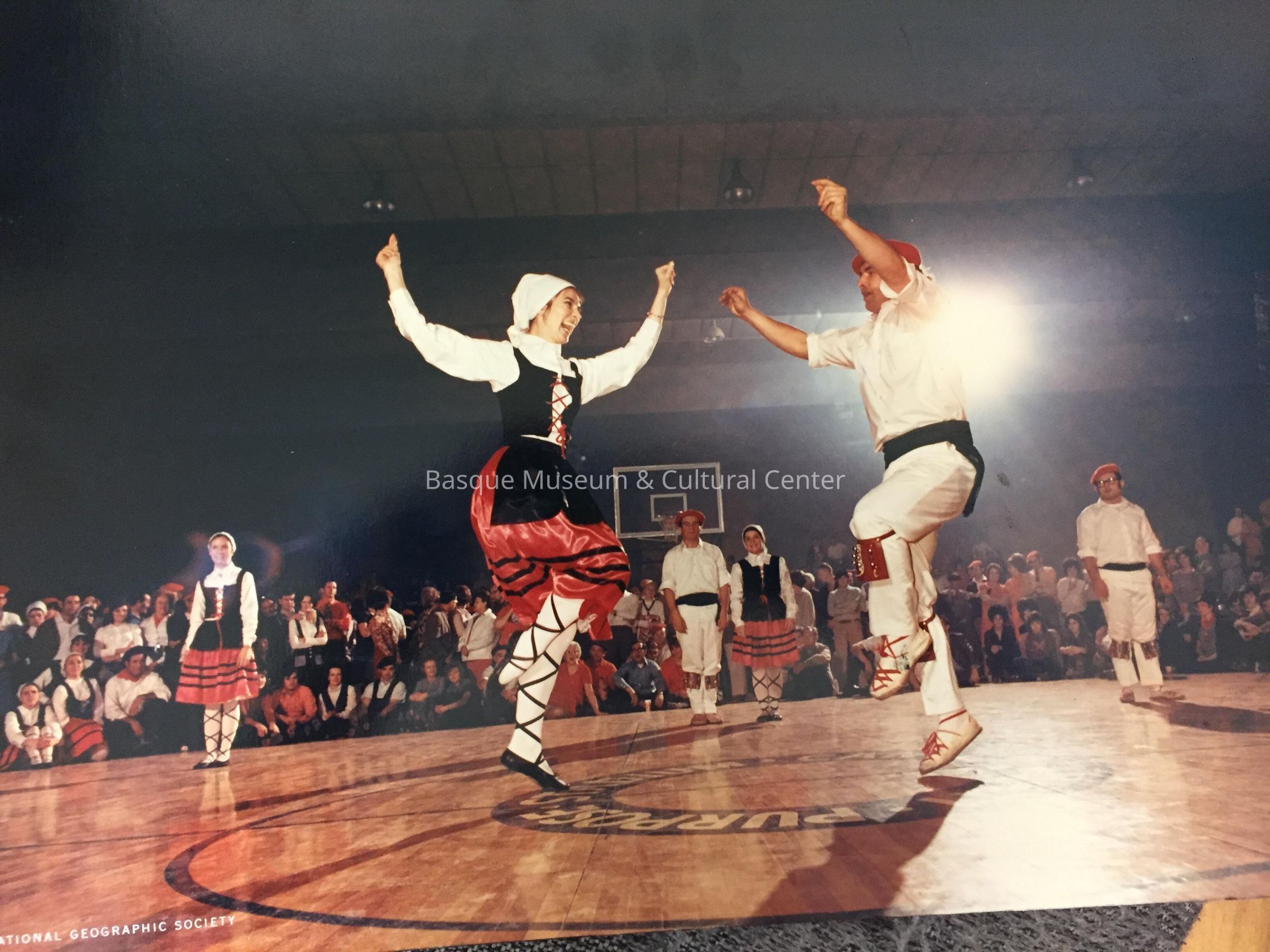 Color photoprint, mounted on cardboard, showing Gloria Garatea Lejardi (L) and Francis "Patxi" Lostra, members of the Oinkari Basque Dancers performing in a gymnasium. There are four other Oinkari dancers and a crowd watching in the backgroud. Dancers in the back are, L-R: Bonnie Ansotegui Kerns, Albert Totorica, Christina Totorical Ilett, and Tom Larrinaga.