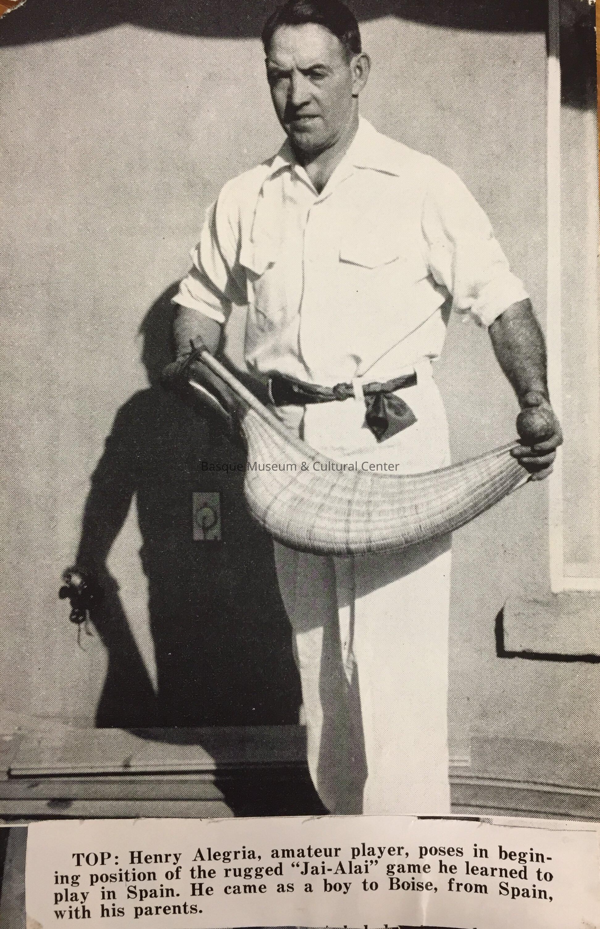 Black and white halftone photoprint of Henry Alegria holding a Jai-Alai cesta, clipped from an unidentified magazine. A caption attached to the bottom reads:
