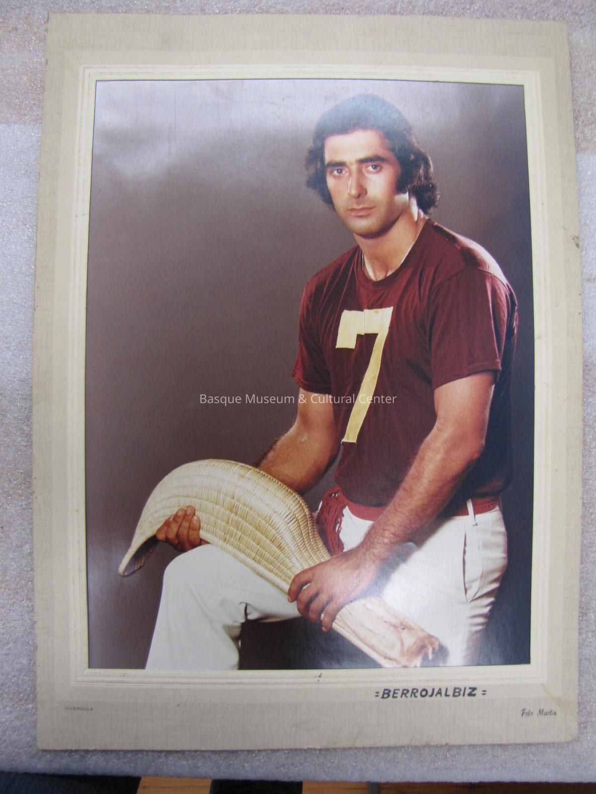 Photo of Jai Alai Player; Underneath the photo on the matte it says "Berrojalbiz"; "Foto Martin"; "Guernica"; Grey/Ivory colored matte surrounding photo; Back is light ivory; Yellow stains from adhesive; Man has dark hair and eyebrows, Maroon shirt with number 7 on it, white pants, red sash at waist, jai alai player.