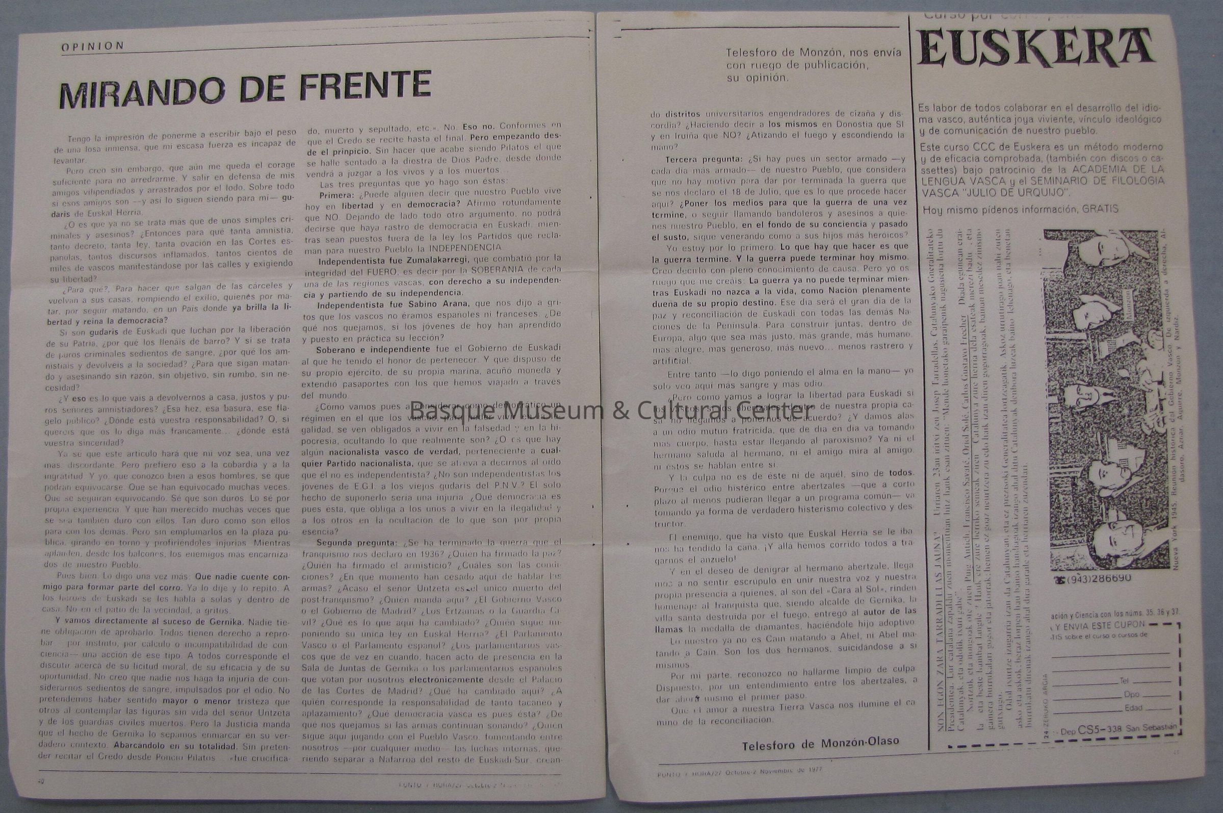 Opinion article from "Punto y Hora", a periodical from the Basque Country; Monzon begins the letter by talking about the situation in the Basque Country; he continues by asking three questions (Can anyone say that the Basque Country [at the time] was a free democracy? No. Is the war that Franco began in 1936 over? No. If we're able, should we end the war? Yes.) and his opinions of what the answers are; he ends by saying that the love for the homeland should lead everyone to what to do; printed on two single-sided pages.