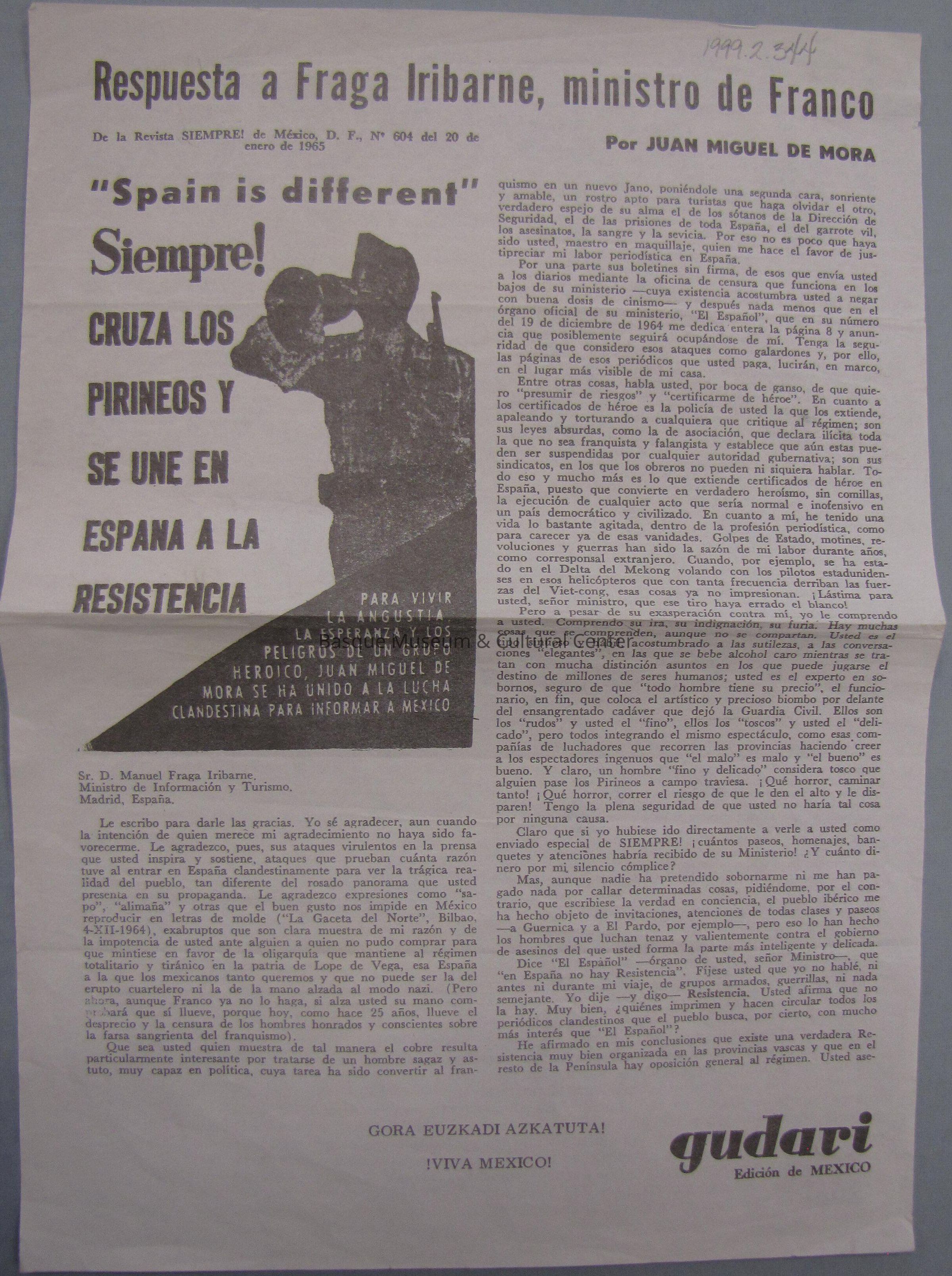 Insert to Mexican magazine, Siempre!; text in Spanish; by Juan Miguel De Mora; written as if it's a letter; Mora is "thanking" Franco but tone leads the reader to believe he's being sarcastic; Mora supports the Basque movement