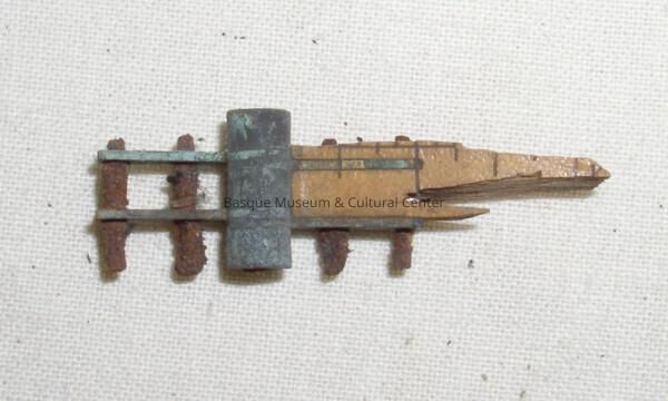 Metal hinge and attached fragment of wood from a folding ruler. This particular type of ruler is usually hinged in 6" section, and used to measure the inside of window and door frames. The column-shaped metal hinge has two arms coming off each side, each having two metal posts perpendicular to the arm to anchor the wooden ruler. A fragment of the wood is still attached to one side. The wood is lacquered and has small black lines on both sides. One side is marked in 1/16" increments, the other in 1 centimeter increments.