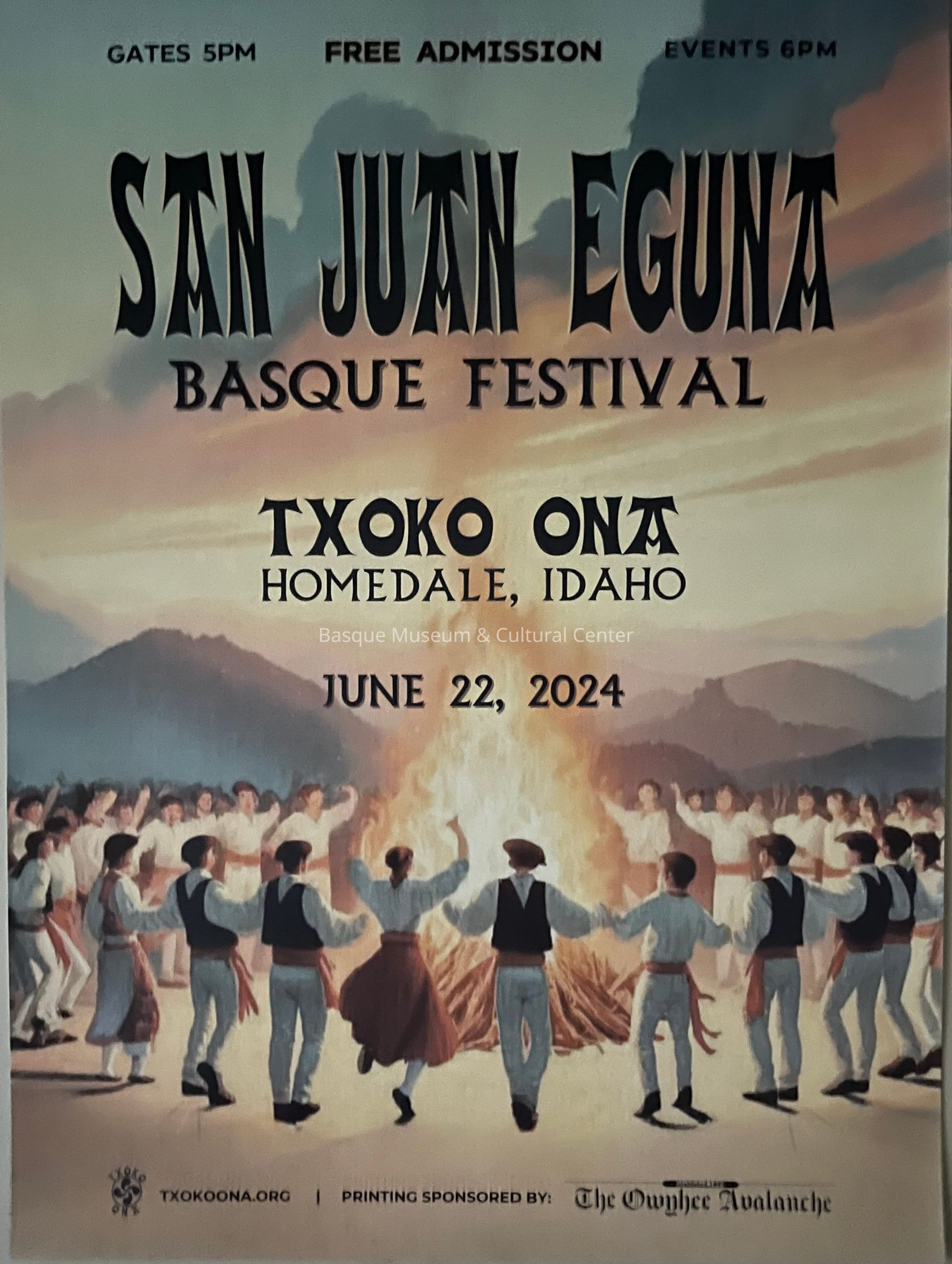 Full-color poster for San Juan Eguna Basque Festival, held by Txoko Ona in Homedale, Idaho on June 22, 2024. Includes a drawing of Basque dancers dancing around a bonfire, location, hours and sponsor.