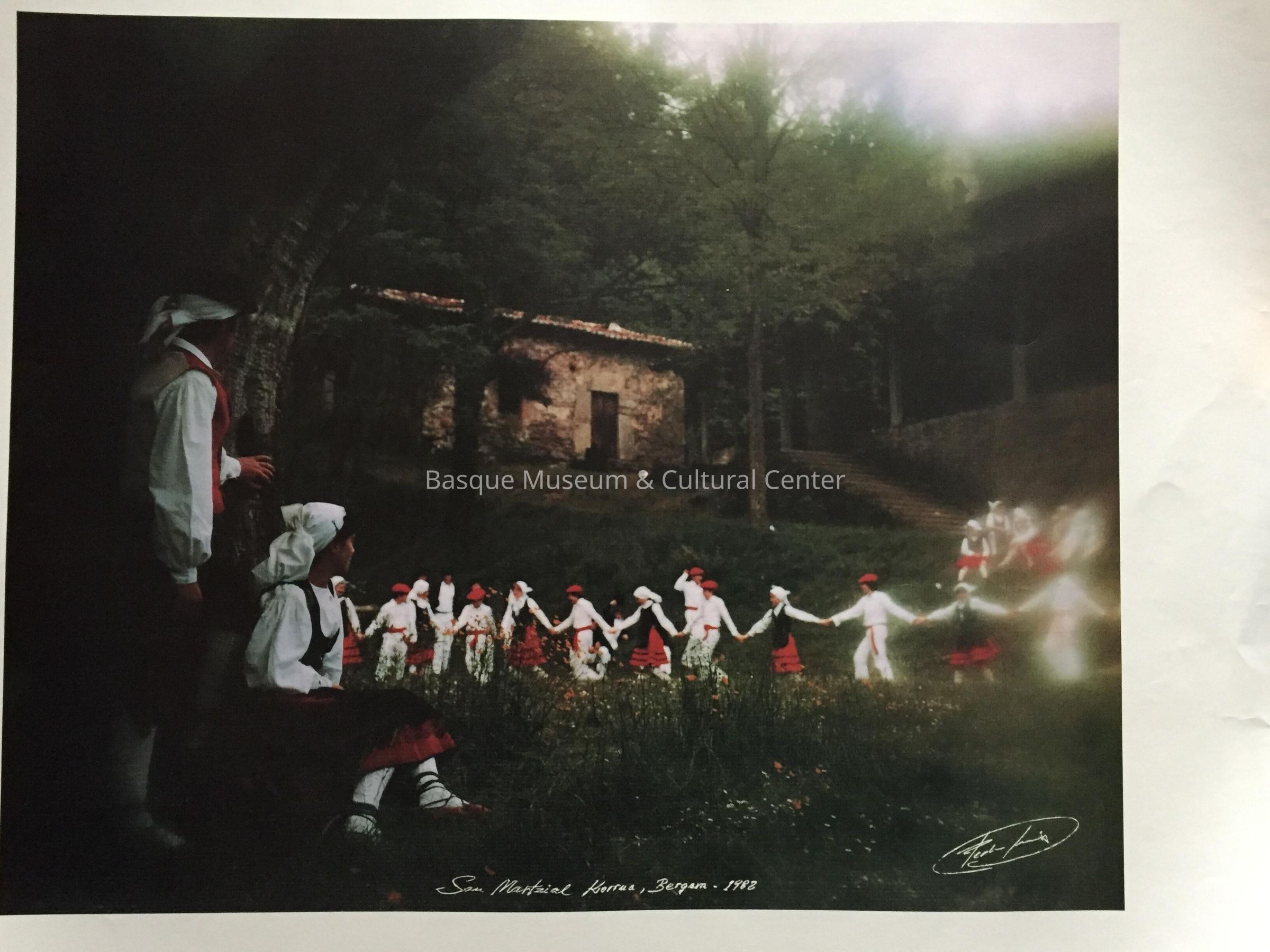 Full-color poster published for the 1991 exhibition, "The Basque People and Their Customs," held at the Basque Museum & Cultural Center in Boise. Depicts a group of Basque dancers in traditional costume performing for the San Martzial festival near Bergara. Photography by Pedro Luis.