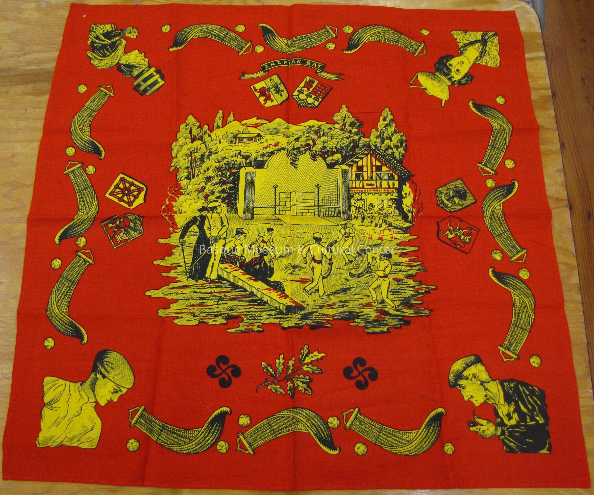 One red, yellow, and black scarf. The scarf has an image of the phrase Zazpiak Bat (a seven), which refers to all 7 Basque provinces as "all seven are one". The phrase in in black and yellow. There is an image of an elderly mans upper body, smoking from a pipe, wearing a suit, and a beret. Another image depicts a womens upper half of body, wearing a shirt, with a scarf, and a teapot on her head. There is another image of a man's upper body, wearing a shirt, and a beret. Images are in black, and yellow. There is an elderly women's upper body image, wearing a dress, with a scarf, and a bucket on her head,. There are 12 yellow, and black images of a Long xistera, and 24 Jai Alai balls. Additionally, there are 6 shields with the various crests images inside of the shields, for 6 of the 7 provinces in the Basque country. There is a yellow, black, and red image in center of a Basque village, with a fronton, and a house. 4 men play pilota in uniform, while 8 men, and 1 women are spectators. Images are yellow, black, and red. There is one yellow, and black olive branch, and 2 black lauburu's, underneath village image. Rest of scarf is red, and made of cotton.