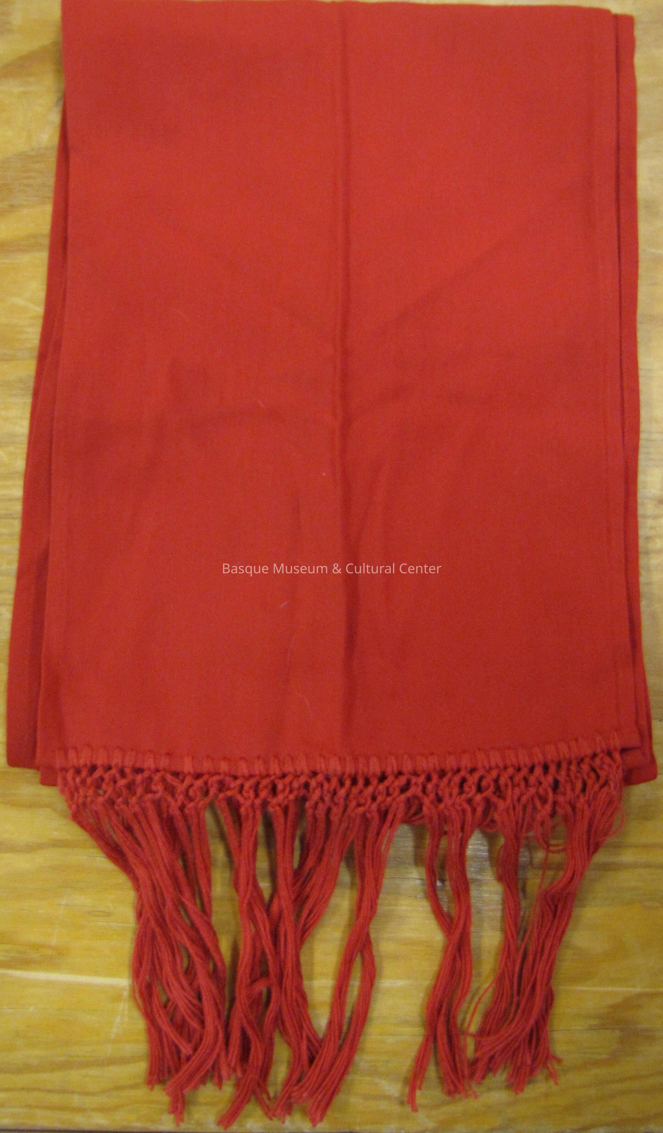 One red scarf made from cotton. Scarf has threaded cotton braids at each end, and is a rectangular in shape. Scarf could have been used during the "running of the bulls" in Pamplona.
