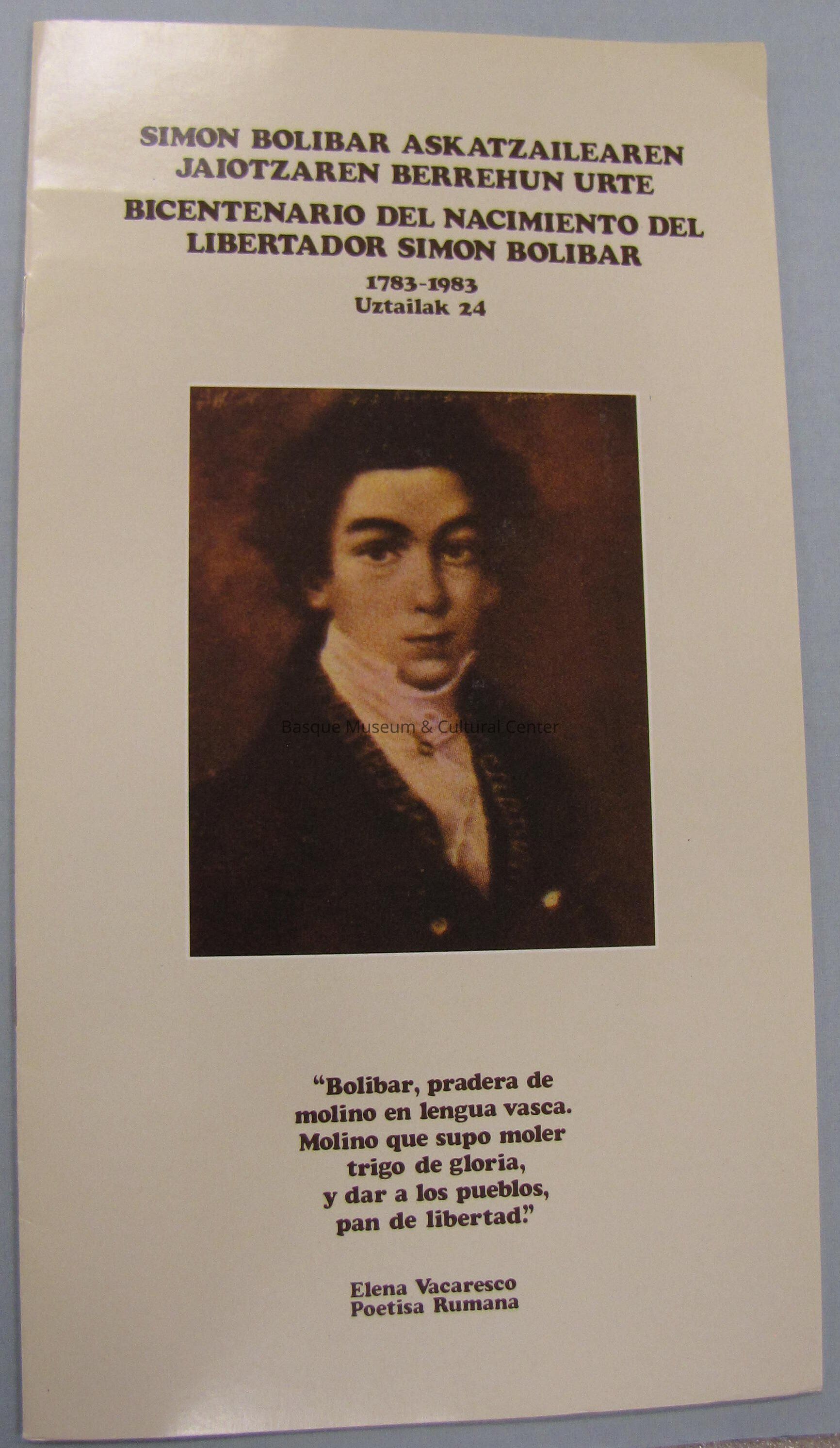 Dual-language booklet in Basque and Spanish about activities undertaken in the Basque country to commmerate the bicentennial of the birth of Simon Bolivar, including aquireing a house linked to his family with the intention of making it a museum.