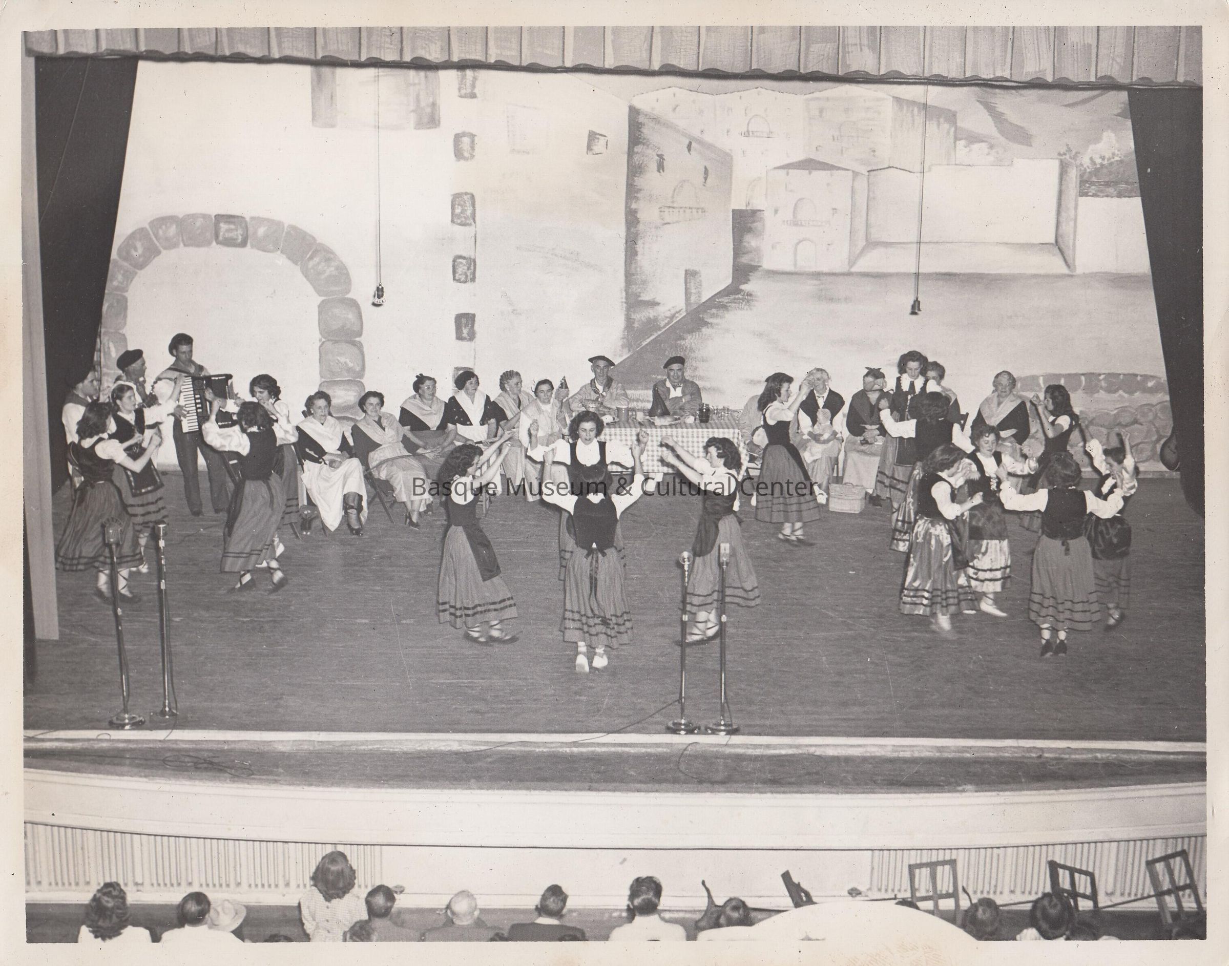 Digital scan of a black and white photoprint: Candid photo graph of dancers during the Song of the Basque performance at Boise High School.