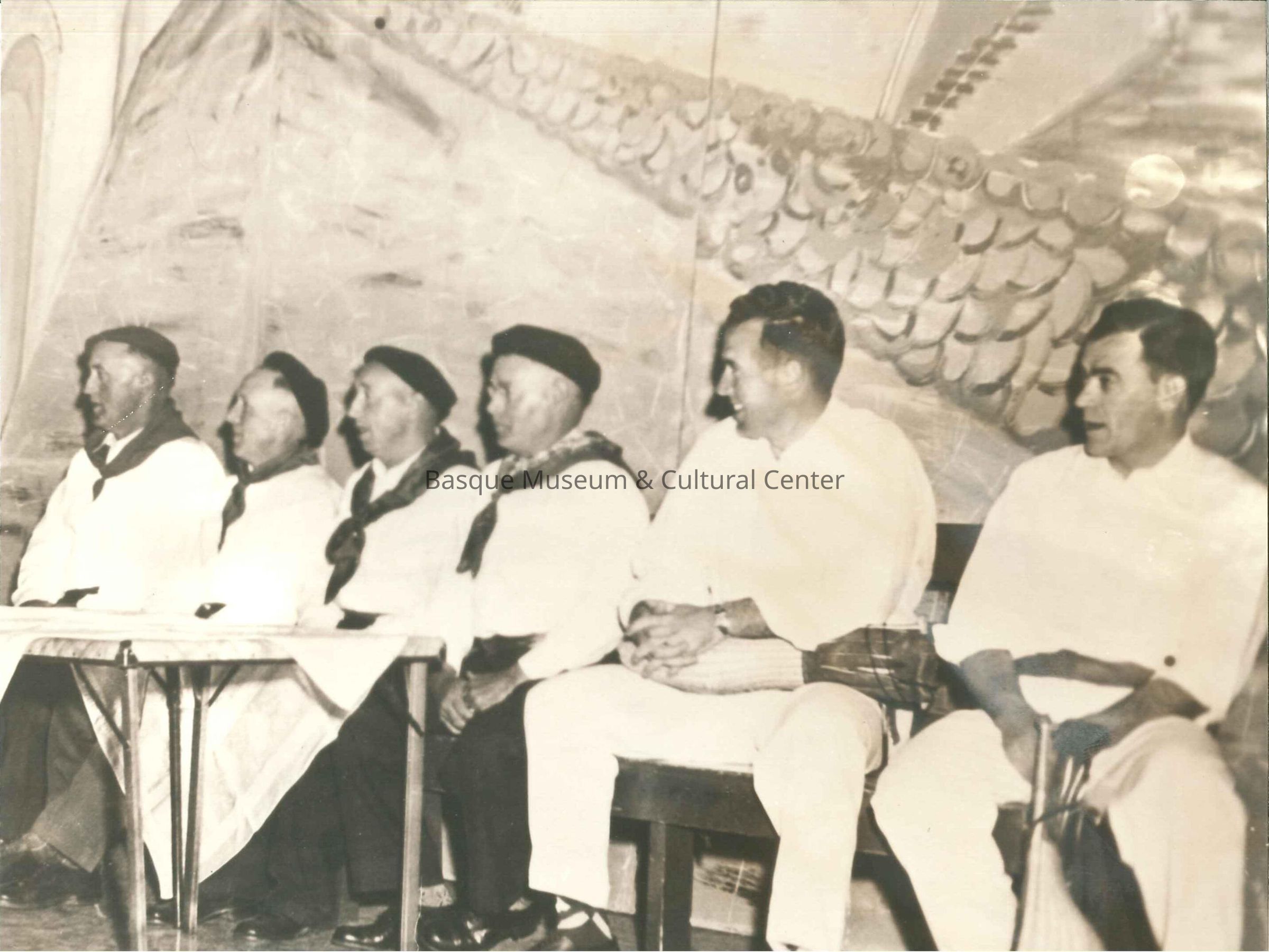 Copy of a black and white photo of four men in txapelas and neck scarves sitting at a table looking to their right, two men on their left also looking in that direction wearing whites with gerrikos and jai alai cestas on their laps.