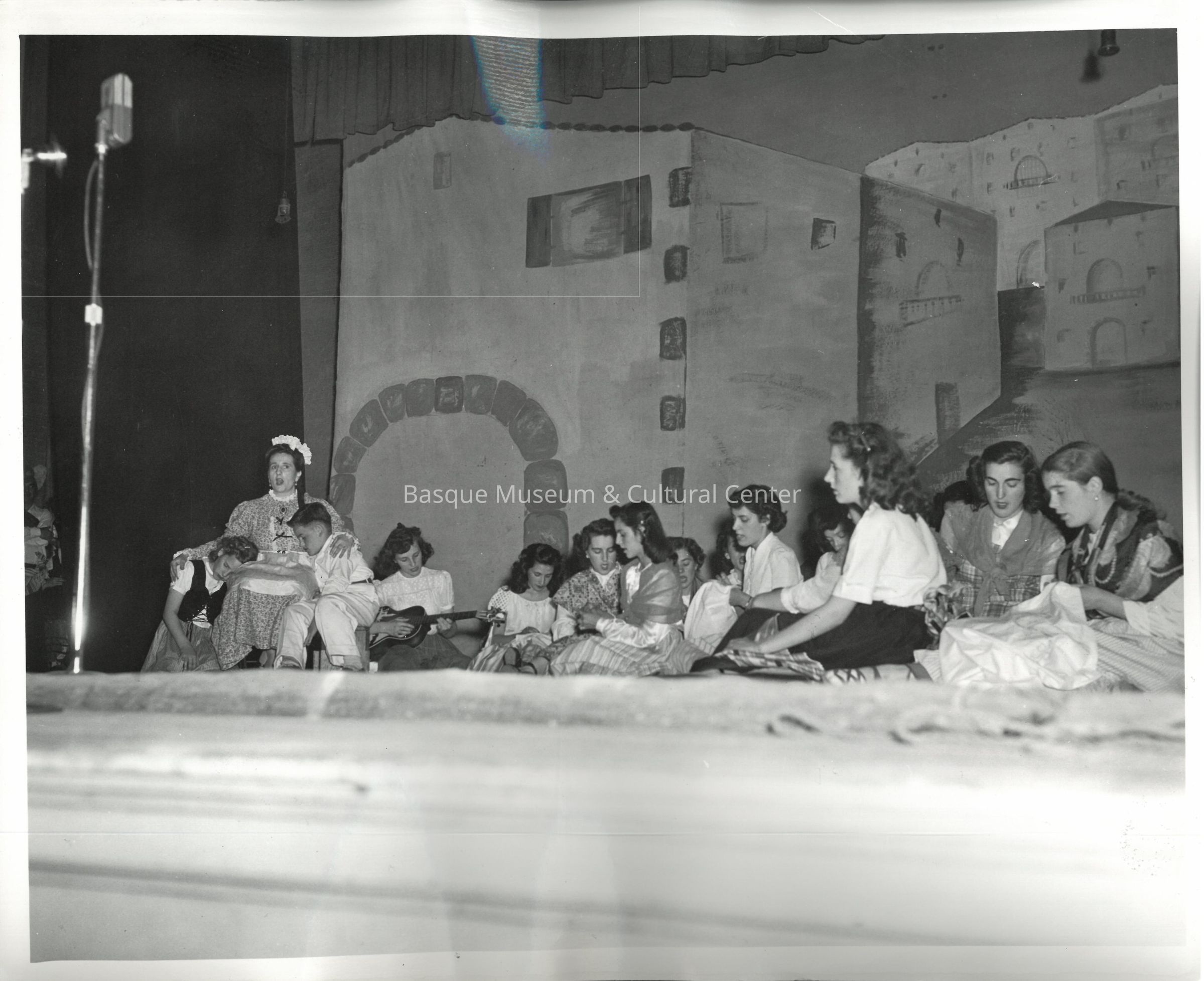A digital scan of a black and white photoprint: Candid photo of a group of female performers in costume on stage at the Boise High School Auditorium for the Song of the Basques performance for Boise Music Week 1949.