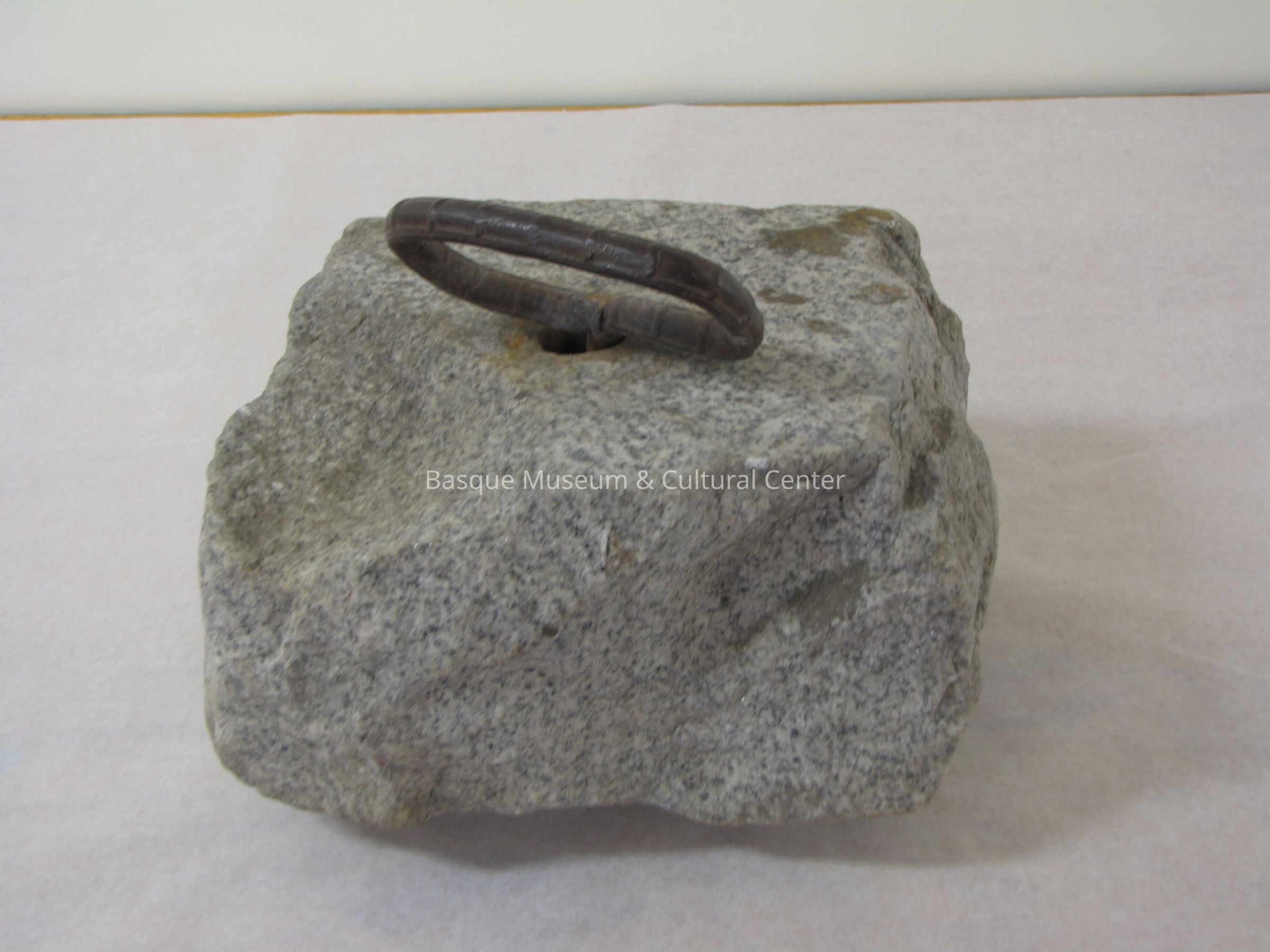 Solid stone of granite with a curved piece of metal rebar as a handle; rock was used to throw during Basque picnics to see who could throw the farthest and be the strongest; the rock is solid grey granite with many crags and some dirt; the rock is not smooth but has many pieces taken out due to wear; the rebar goes through a hole in the middle of the stone through a smooth circular hole and is held by the rebar being in the shape of a "T" on the bottom to insure that the rebar does not slide out; the top of the rebar is made to represent a flat "D" handle and is bent at a 45 degree angle; the rebar has rust starting to show; picnics at which this was thrown had games that were supervised by Phil Uberuaga who led them for many years.