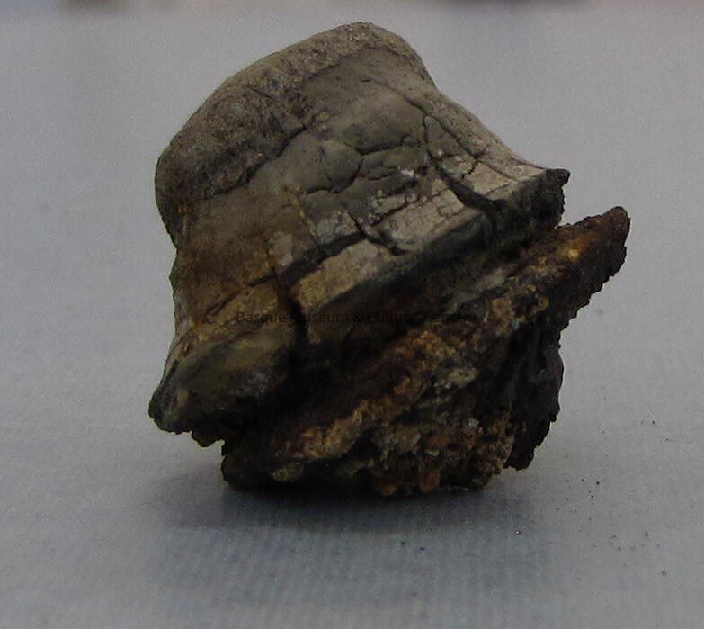 Tapered cork attached to a small metal topper; metal is heavily corroded, but a small fingerhold is visible; cork is cracked and is missing some pieces of the outer lip.