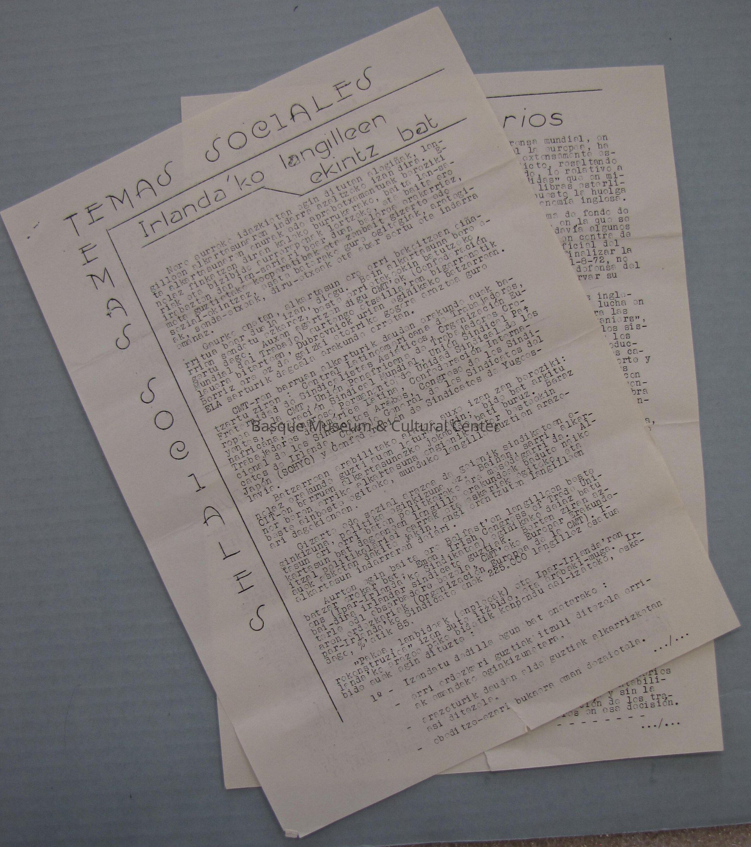 Undated, typewritten newsletter; Headed "Temas Sociales" (Social Topics); First article is in Basque and runs 1 1/2 pages; second article is about the Anniversary of the Invasion of Czechoslovakia; the next secion is on News and ommentary and has articles on the 2nd Congress of the European Organization of the World Commission of Work, a Strike in an English Port, and the Community and Worker's Press as well as two small articles in Basque.