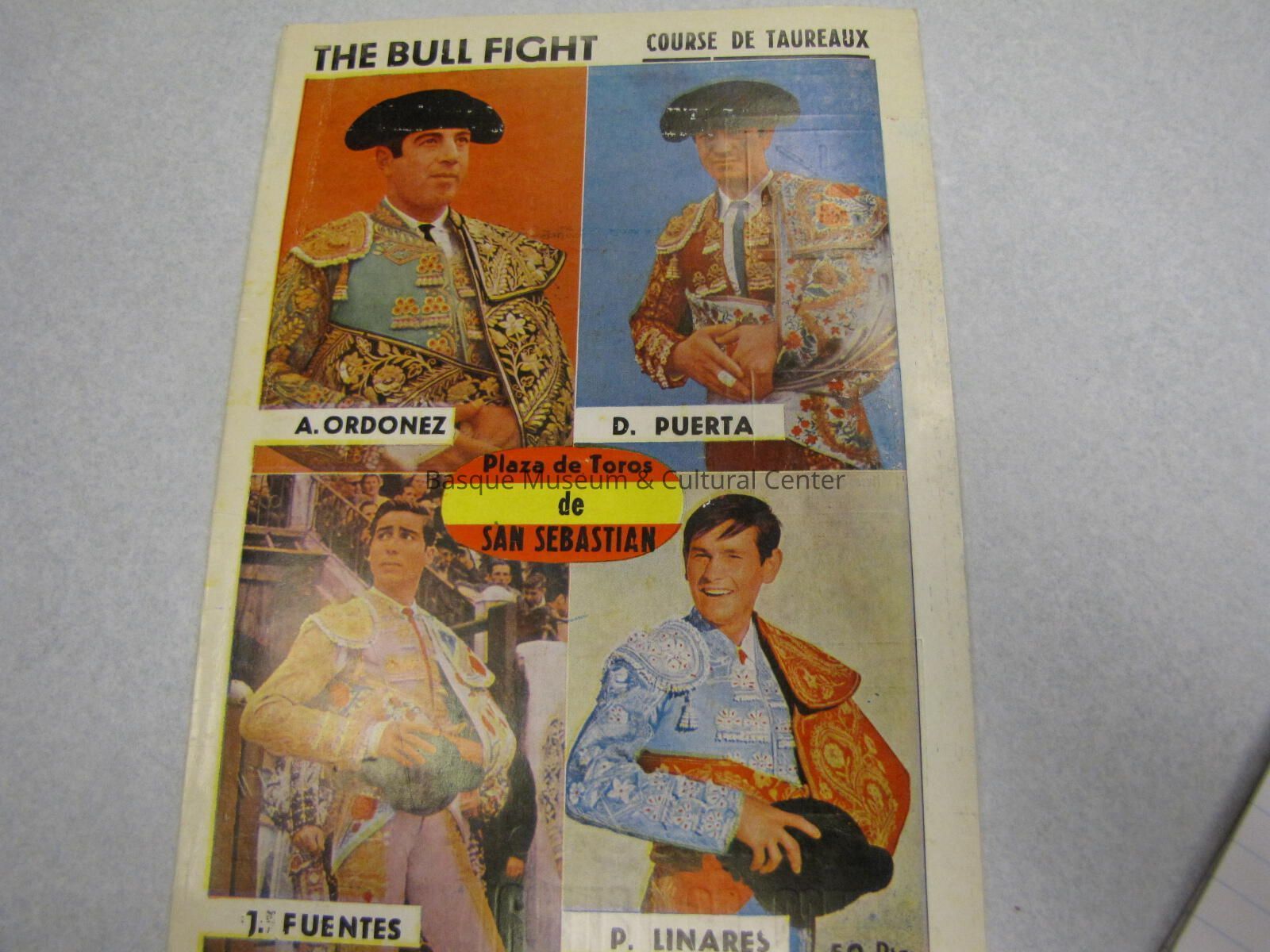 Program about types of bull fighting, the different bull fighters, arenas and bulls. Full of pictures and sketches. Program paper on the inside for the Plaza de Toros de San Sebastian with a list of the different fights and fighters schedules. Cover is four large photos of different bull fighters. Title is in the center over a red and yellos stripped oval. Their names are below their pictures, and the same is on the back.
