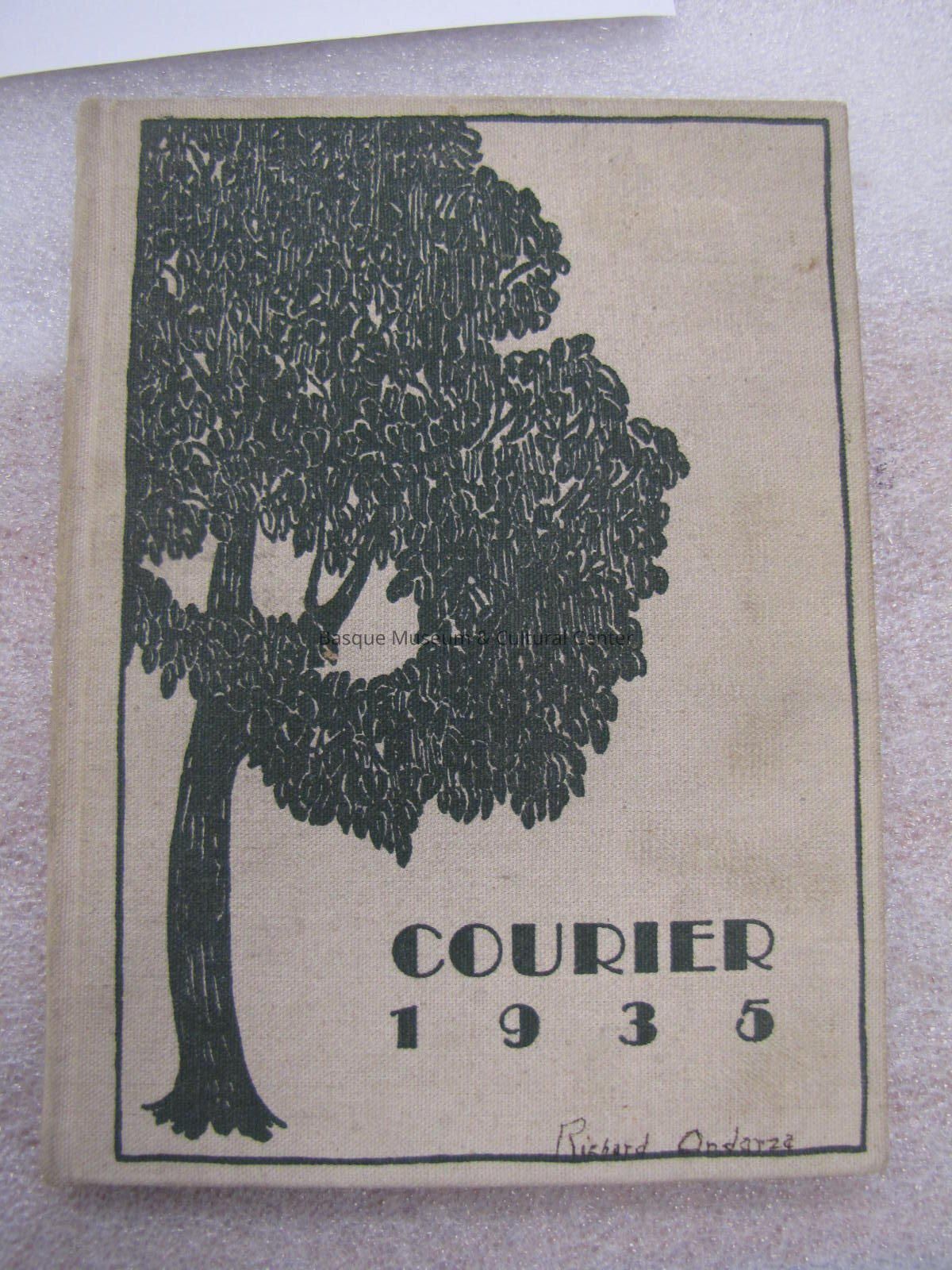 Richard Ondarza's high school yearbook; Boise High School 1935; Inside cover is green and black ink image of Lewis and Clark coming upon the treasure alley- someone wrote a speech bubble with the words "Les Bois, Les Bois" in it; "The Courier" Published each year by the Associated Student Body; "In the year of 1635 a group of thinkers and educators founded the first secondary school in North America. On the three hundredth anniversary of the birth of high schools in America, it is these pioneers that we gratefully dedicate the 1935 Courier"; Many signatures in ink and marker throughout; 111 pages; Tan textured cover with a green tree on the left side.
