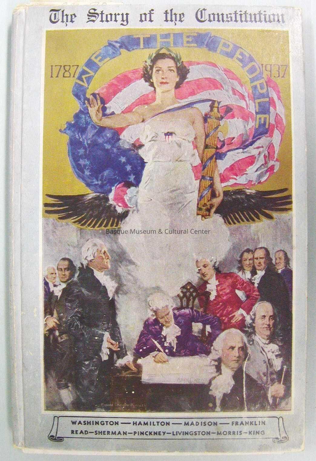 Book, "The Story of the Constitution", by Sol Bloom. 192 pages. Copyright, 1937. Book is essentially a primer for study of American government and history. Cover has a picture of Lady Liberty and the Founding Fathers. Inside front cover has a stamp that reads "COMPLIMENTS Boise Junior Chamber of Commerce Americanism Week 1940" and is inscribed in pencil "Jose Garate".