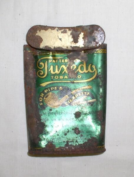 Pocket tobacco tin found on the east wall foundation ledge in the basement of 607 Grove Street in Boise, Idaho. The tin is tall, slim, and curved to fit in a pocket. It has a hinged lid and flat base. The main colors of the body and logos or decoration are white, black, gold, brown, and dark green. Text on the concave side of the tin reads: "Patterson's Tuxedo Tobacco," a graphic of a man in a tuxedo smoking a pipe appears above, "Specially Prepared for Pipe & Cigarette," "RA Patterson Tobo. Co. The American Tobacco Co. Successor (Incorporated)." The convex side of the tin reads: "Patterson's Tuxedo Tobacco For Pipe & Cigarette" with a graphic of a pipe and two cigarettes. "The perfection of 50 years experience in the tobacco business. Does not bite the tongue nor make the mouth sore." appears in black script over "RA Patterson Tobo. Co. The American Tobacco Co. Successor (Incorporated)." Printed vertically in small black letters on the right side of the concave side, "Pat'd Feb. 6th 1906 NO. 812175." In a rectangle next to the patent information is: "Factory No. 127, Dist. of KY. Notice - the manufacturer of this tobacco has complied with all the requirements of law every person is cautioned _ _ _ _ penalties of _ _ _ _ to use this package of tobacco again _ _ _ _ _." The final area of text on this tobacco tin is under the lid: "Guarantee. If the tobacco in this tin is not found entirely satisfactory, return the tin with contents to your dealer and he will refund your money. TO DEALER - See our guarantee on carton." There are remnants of a paper label on the top of the lid (blue paper with black ink) and also between the 'X' and 'E' of "Tuxedo" on the side of the tin with the pipe logo.