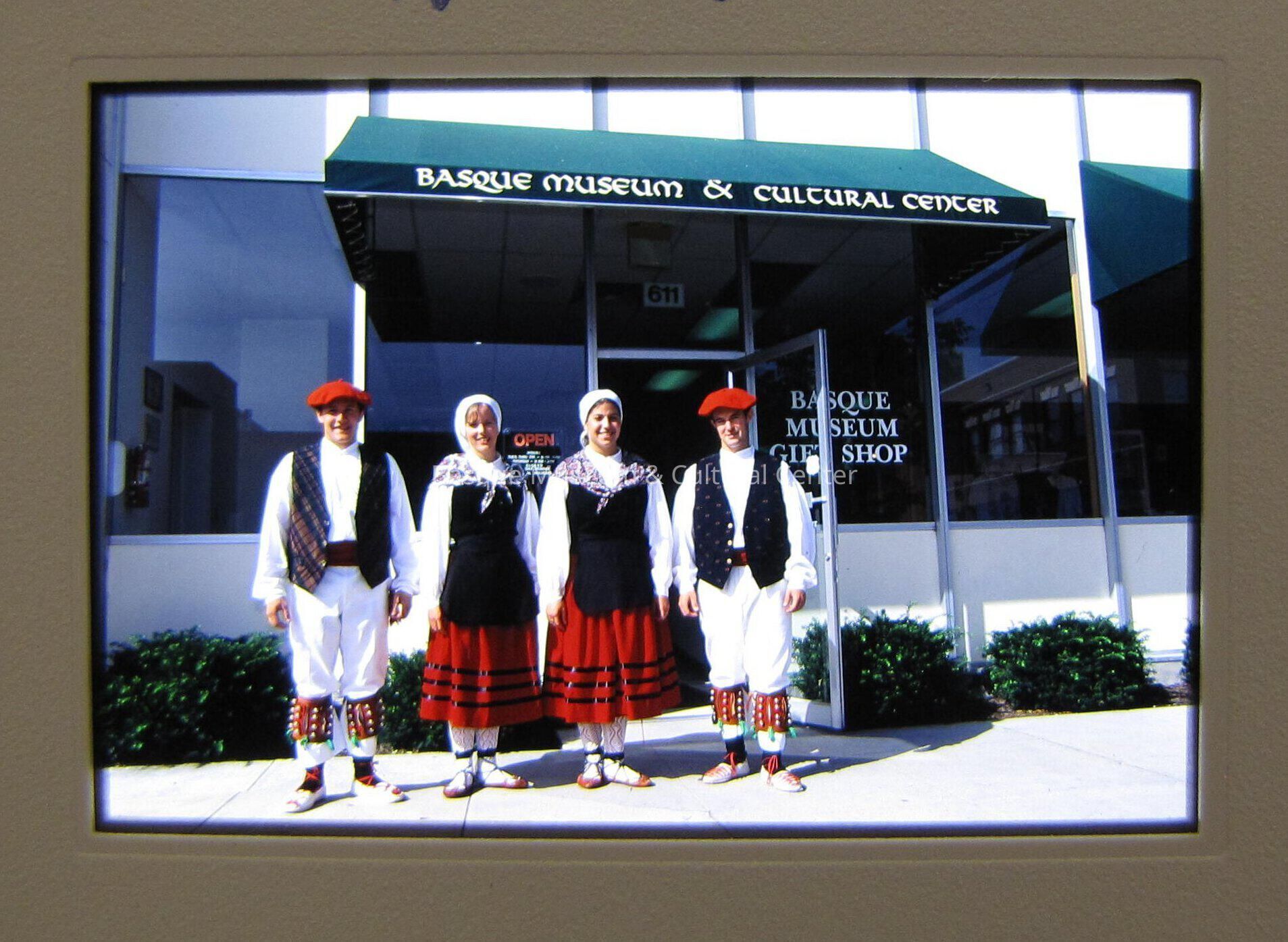 Slide transparency picture. L-R: Xanti Alcelay, Erin Hardesty Brady, Ysabel Bilbao and Ryan Schaffner dressed in traditional Basque dancing costumes standing outside the door of the Basque Museum; men are wearing abarkak, bells, white pants and shirts, gerrikos, vests, and txapelas and are standing on the outside; women are wearing abarkak, red skirts, black aprons and vests, neckscarves, and headscarves.