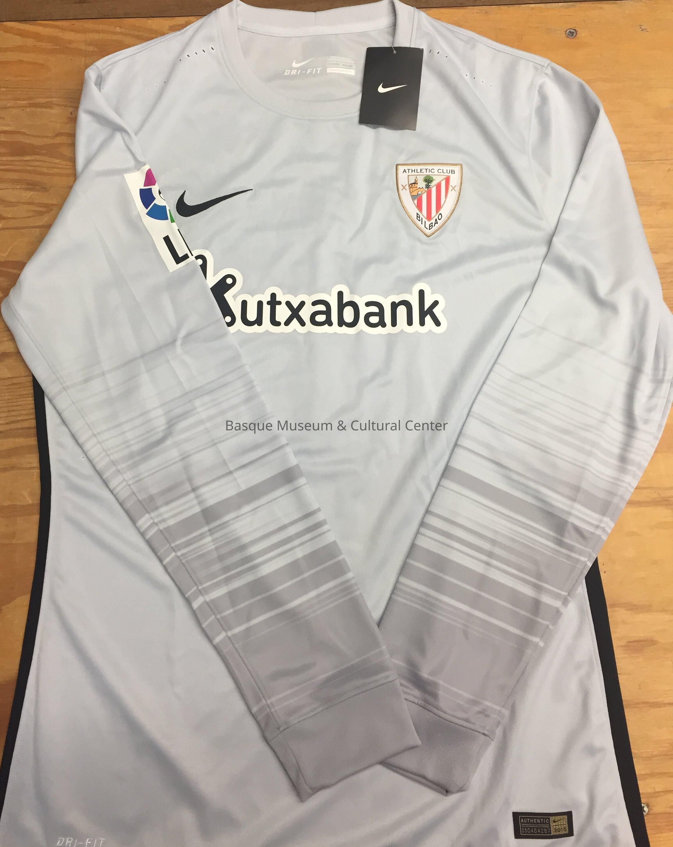Soccer jersey (a), size large, shorts (b), size extra large, and pair of socks from Athletic Club Bilbao. The body of the jersey is light grey with a black stripe under each arm; the long sleeves have darker grey stripes which widen toward the cuff; the cuff and neck are a matching grey ribbing.. The front has a patch with the logo of Athletic Club Bilbao on the upper left; the Nike 'swoosh' in black is on the upper right; an applique that reads, "Kutxabank" [Kutxabank is a sponsor of Athletic Club Bilbao], primarily in black letters is positioned across the chest; "Dri-Fit" is embroidered in white along the lower right edge; and a tag with "Authentic 050764867 2015" is attached to the lower left edge.