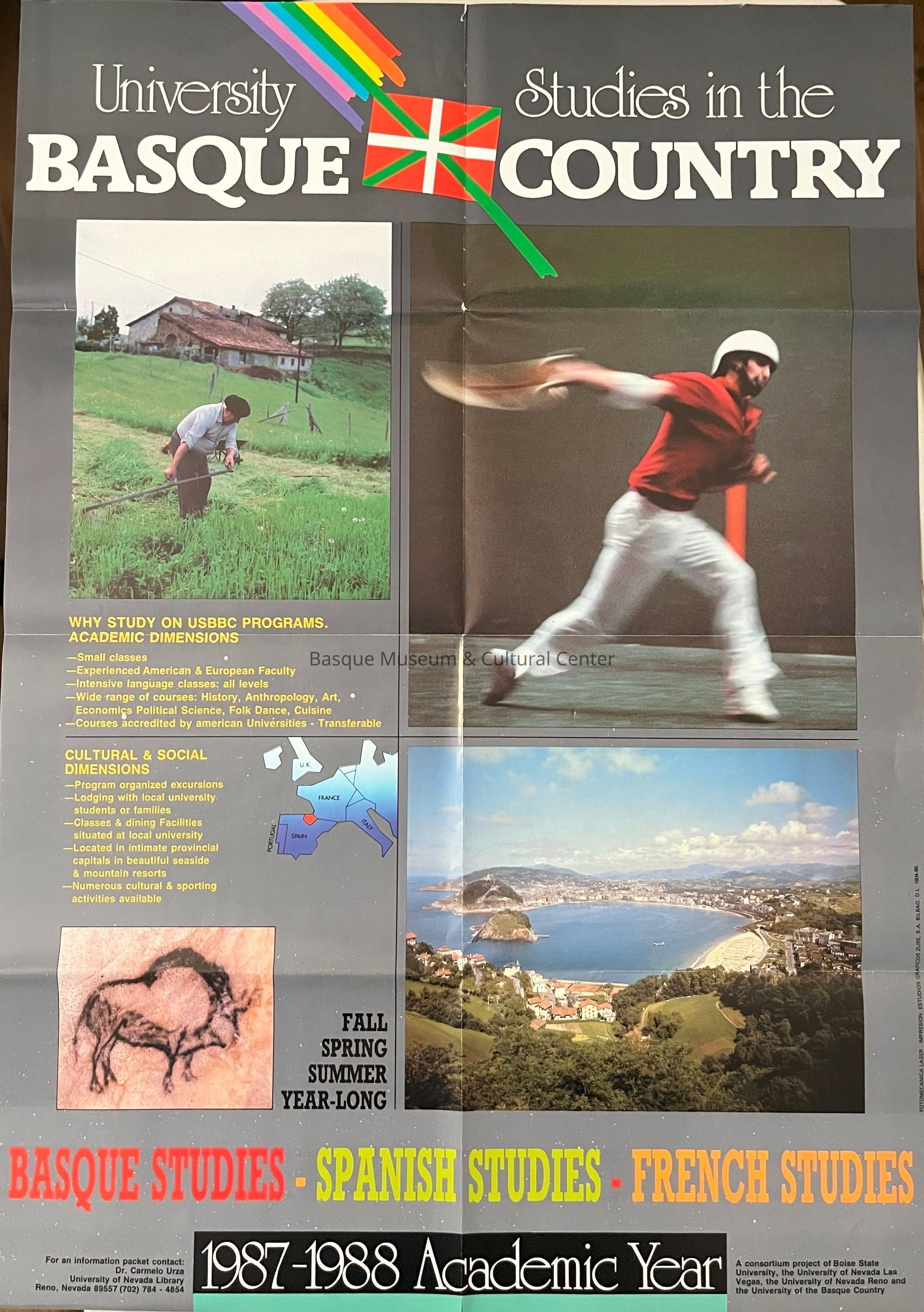 Full-color poster promoting academic studies in the Basque Country, including Basque, Spanish and French studies. Includes 4 photographs, map, description of activities and contact information.