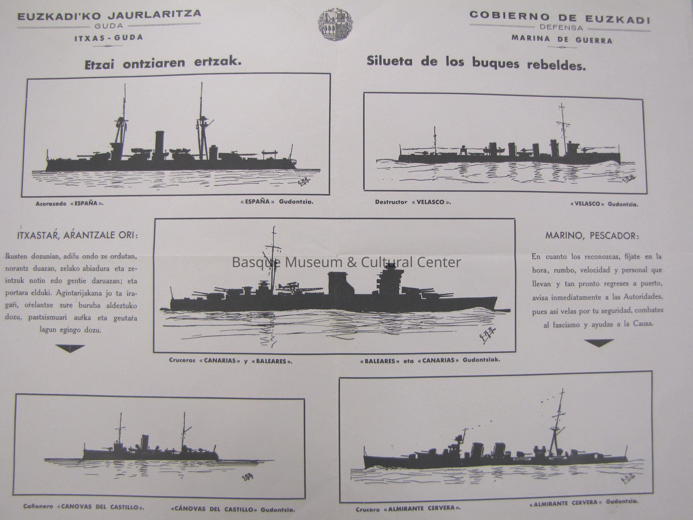 Poster distributed by the Spanish and Basque governments, during the civil war, to help its citizens in the identification of rebe ships. Cream-colored background has five black silhouettes depicting a battleship, destroyer, gunship, and two different classifications of cruisers. Text in Spanish and Basque encourages citizens to report sightings of ships to the authorities.
