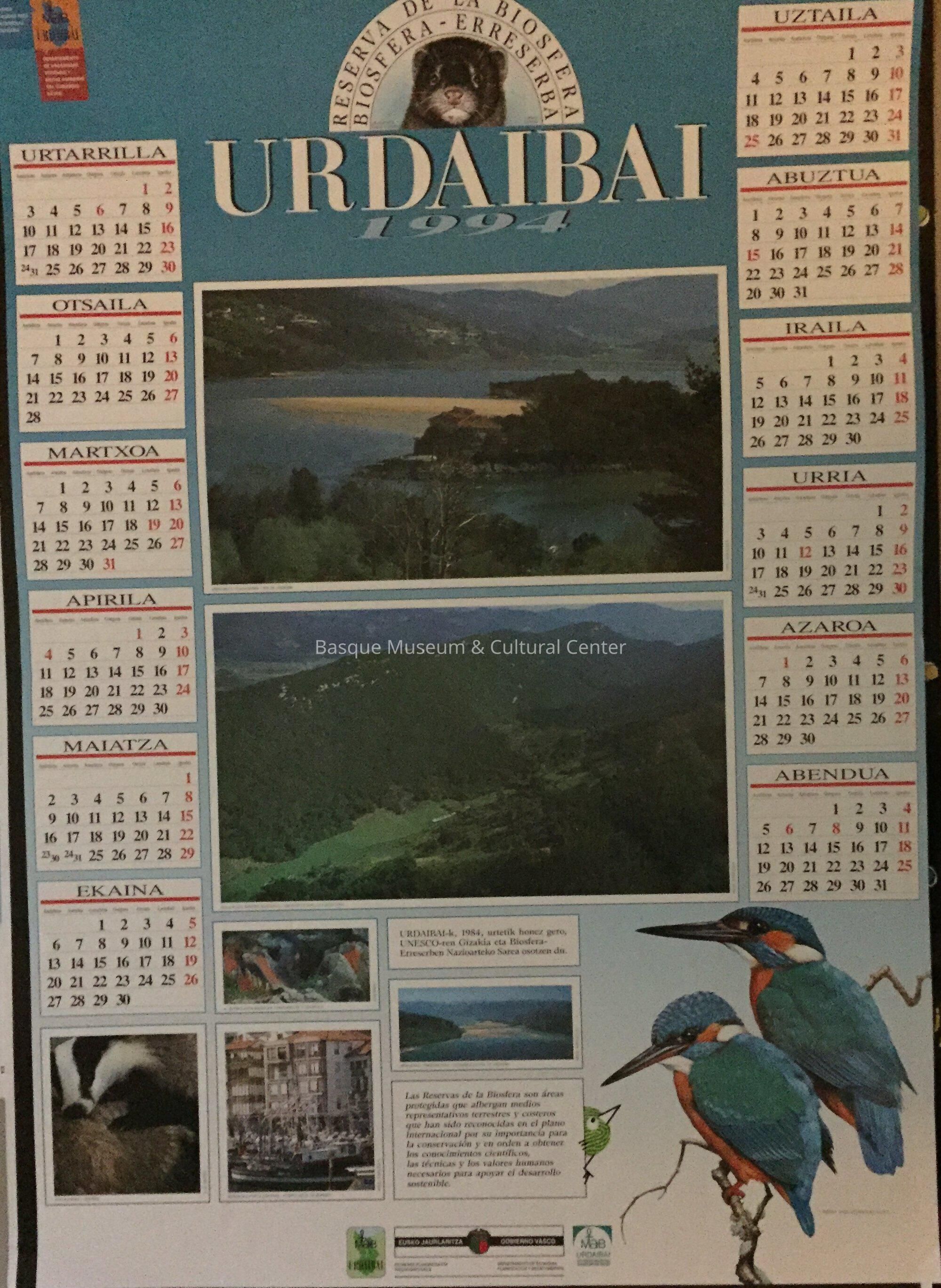 Full-color poster and calendar from Urdaibai Biosphere Reserve in the Basque Country. Features an 1994 monthly calendar, scenic photos, flora and fauna. Published by Eusko Jaurlaritza/Gobierno Vasco.