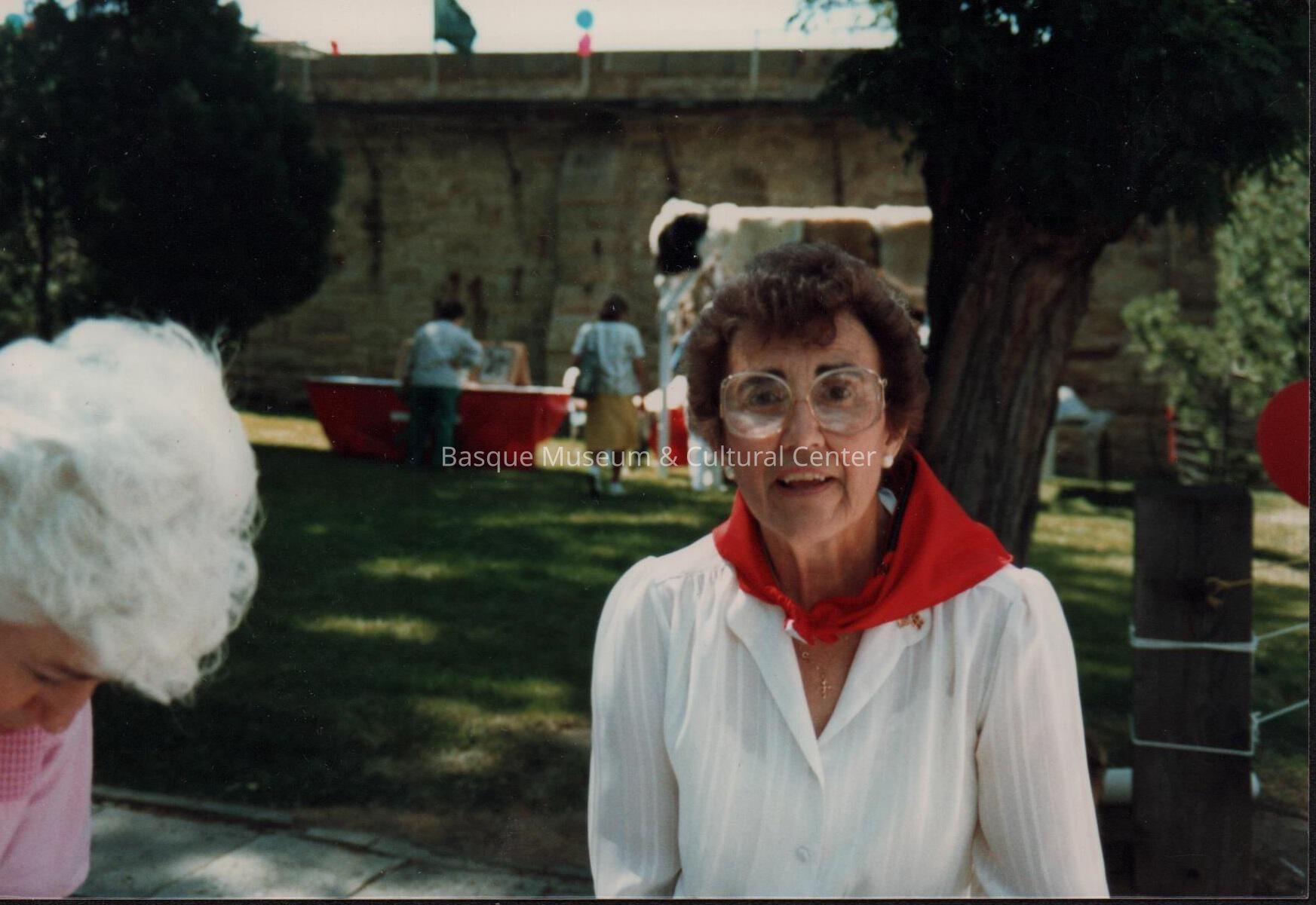 Digital scan of a color photoprint: Victoria Basabe Foruria Alonso standing outside the wall of the Old Idaho Penitentiary in Boise, likely during the Jaialdi festival in 1987.