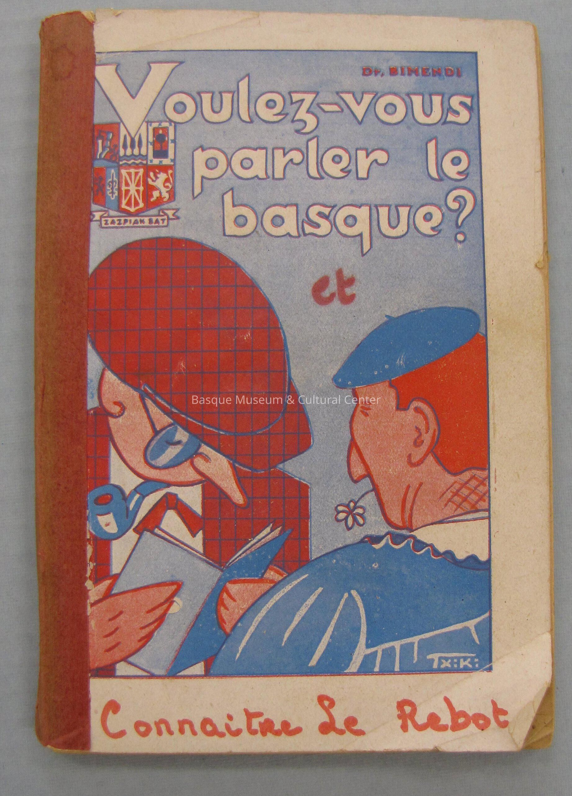 Apparently originally two books that were bound together with red tape; the first portion is "Voulez-vous parler le basque?" by Dr. Bimendi which serves as the front cover; the cover has the author's name over the title, which sits on the Coat-of-Arms of Euskal Herria, all of this hovers over a drawing of two men, one stereotypically French and a book in his hands, and one stereotypically Basque evidently conversing; book contains common phrases in French and Basque for communicational purposes; all illustrations are noted as the work of Txiki; a red marker was used to write "et Connaitre Le Rebot" to signify the addition of the second work; the second book is "Le Rebot et autres: Jeux de pelote basque" by Dr. A. Vergely; book is on the rules and gameplay of Rebot, a form of pelota; the front cover is a white ground with the title and author's name; the back cover lists other books on Basque culture and the address of a store which sells pelota supplies in Saint-Jean-de-Luz.Book Details