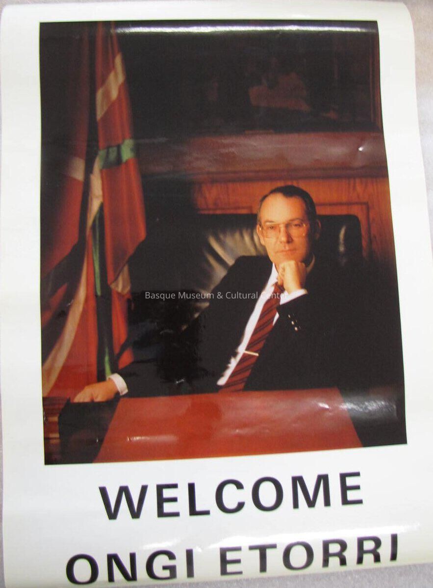 Poster of the Former Basque President (Lehendakari) Jose Antonio Ardanza Garro; Poster is picture of former president sitting at a desk, chin resting on his fist; Basque flag in background , to the left; Wood surrounding; Underneath the picture is the word "Welcome" and "Ongi Etorri"- large black text; White border around picture; Poster is laminated and shiny.