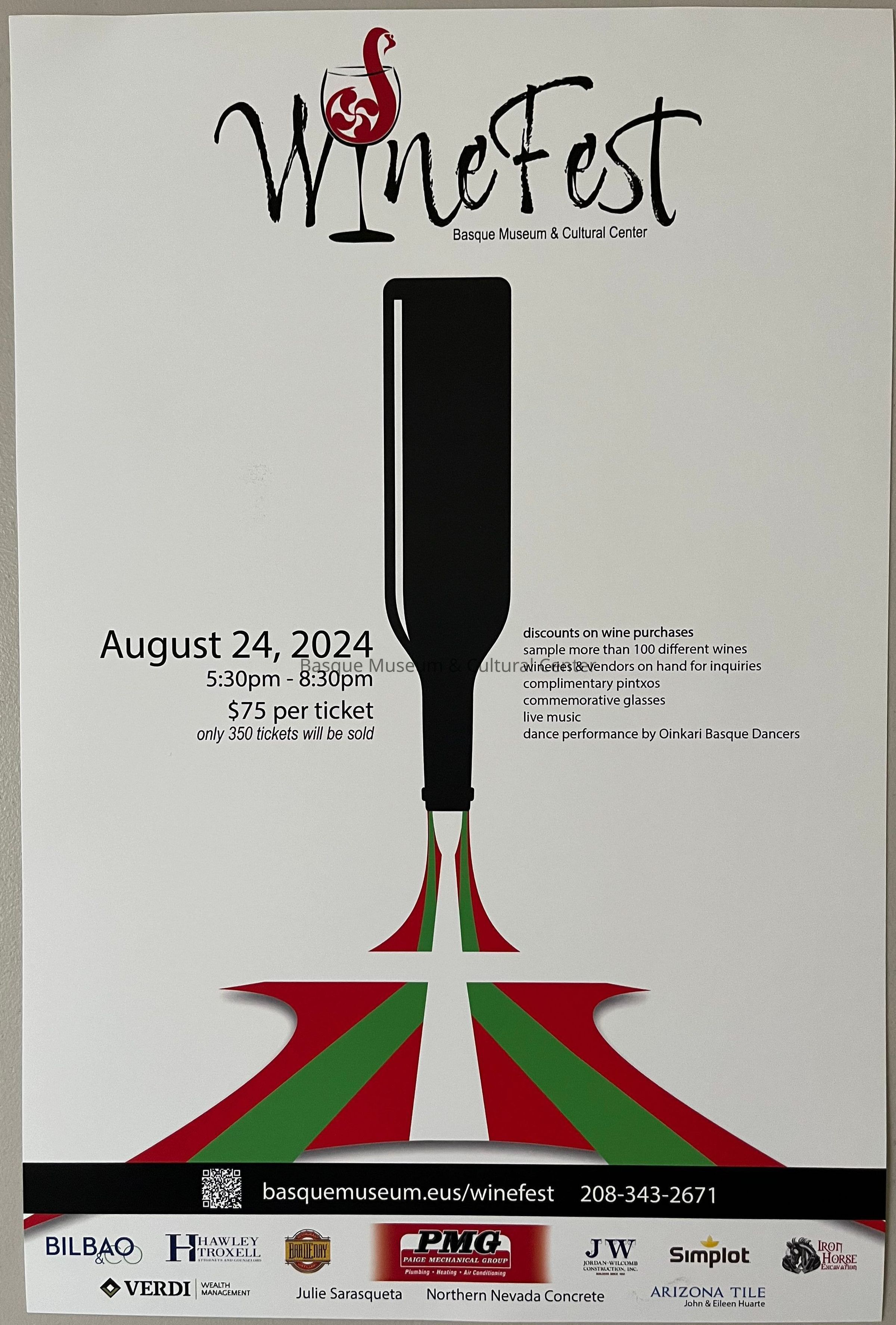 Full-color poster for WineFest, held on August 24, 2024. Includes dates and time, cost, description of activities, contact information, list of sponsors, and a stylized wine bottle and Basque ikurrina (flag).