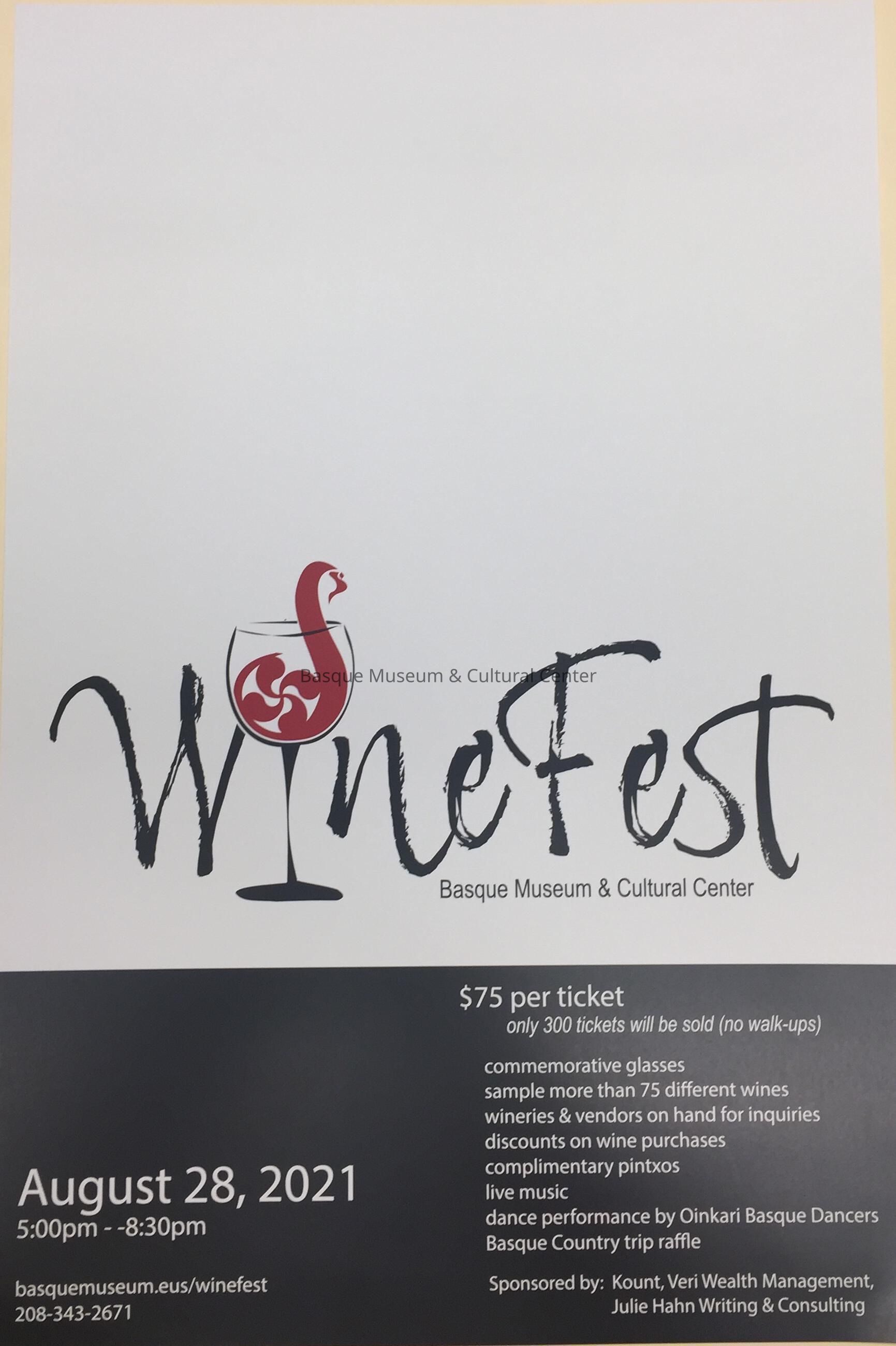 Promotional poster for WineFest to be held on August 28, 2021 in Boise, Idaho. Includes contact information, sponsors and items included with each ticket.