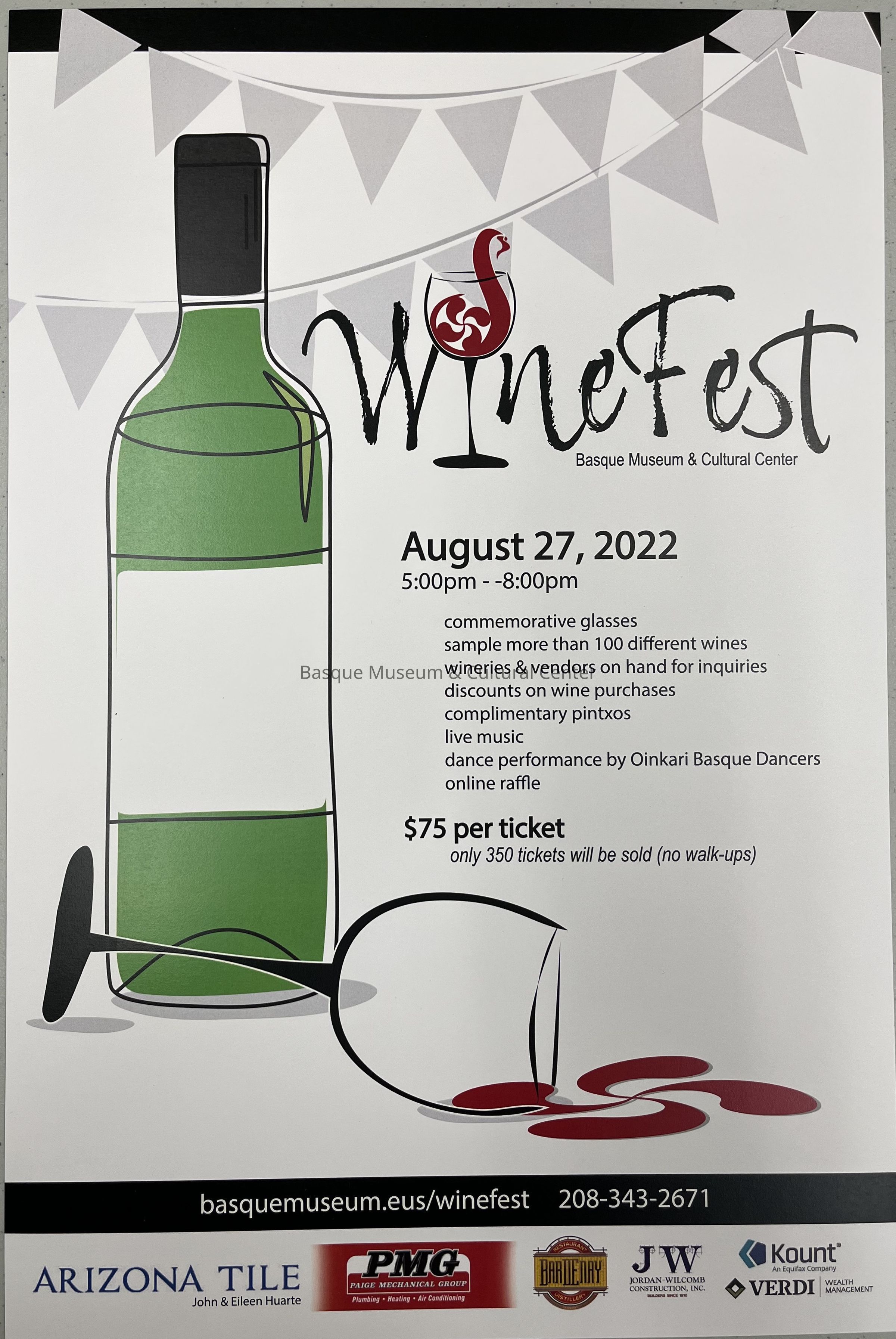 Promotional poster for WineFest to be held on August 27, 2022 in Boise, Idaho. Includes contact information, sponsors and items included with each ticket.