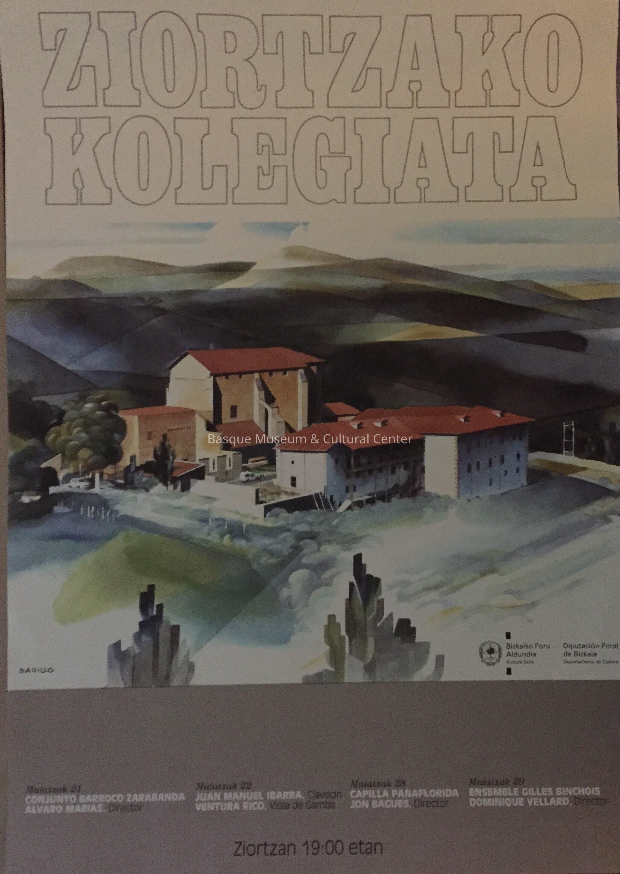 Full-color poster showing stylized drawing of the town of Ziorta-Bolibar, with the Ziortza Collegiate Church at the center. Includes dates and names of a musical program. Sponsored by Bizkaiko Foru Aldundia/Diputacion Foral de Bizkaia.