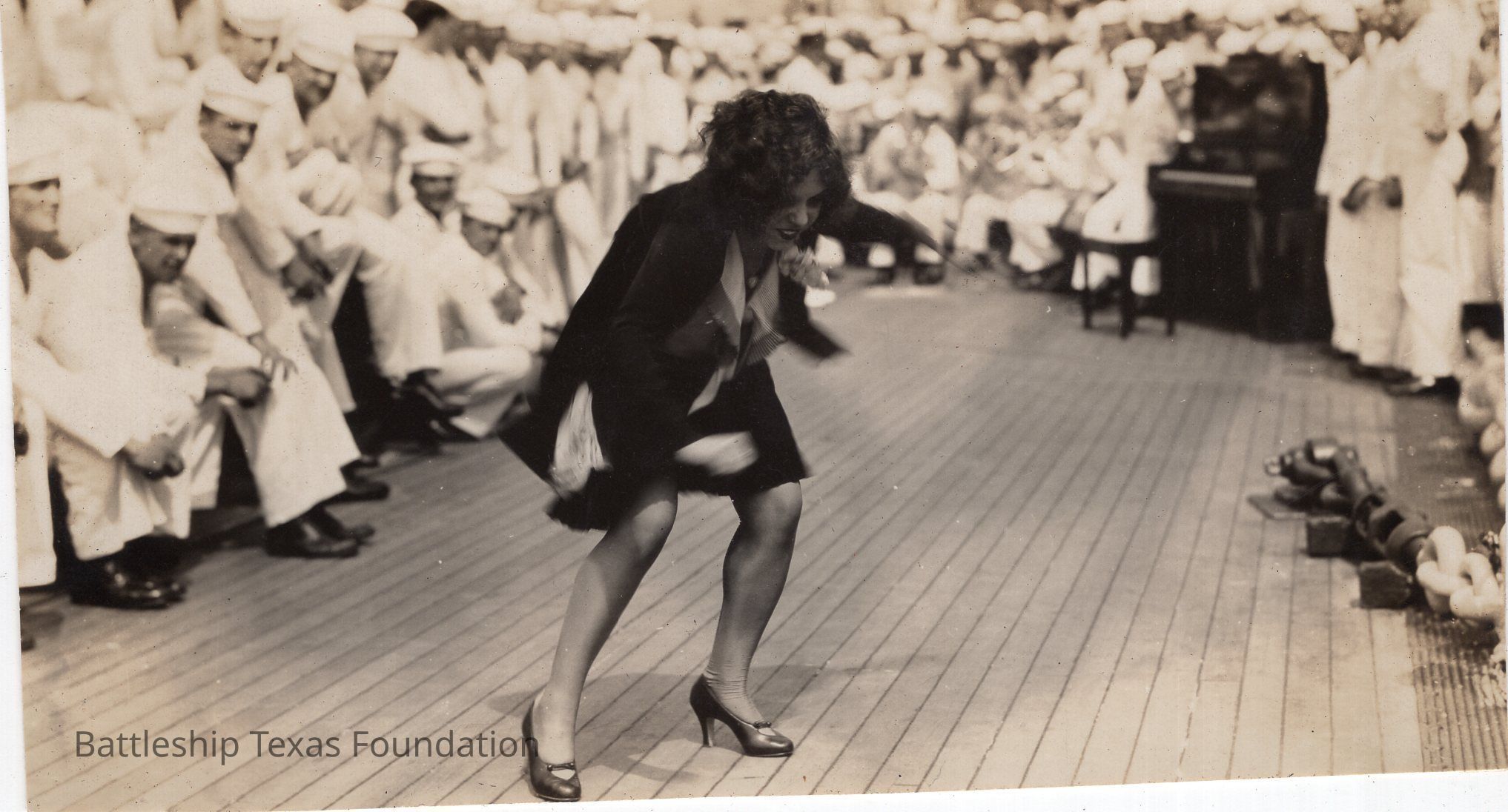 Features a woman performing on main deck with sailors seated and standing around her.Context