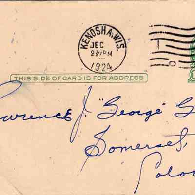 Letter written on postcard by Laurence Gaddis to Somerset, Colorado in December 1924.Context