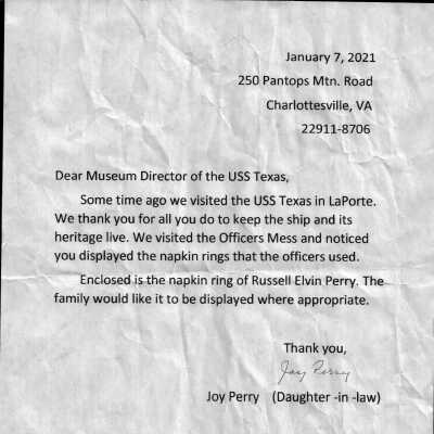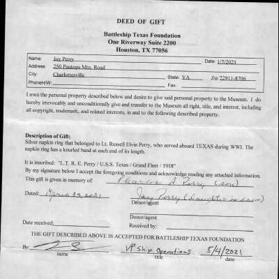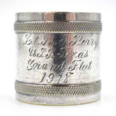 Silver napkin ring that belonged to Lt. Russell Elvin Perry, who served aboard TEXAS during WWI. The napkin ring has a knurled band at each end of its length.