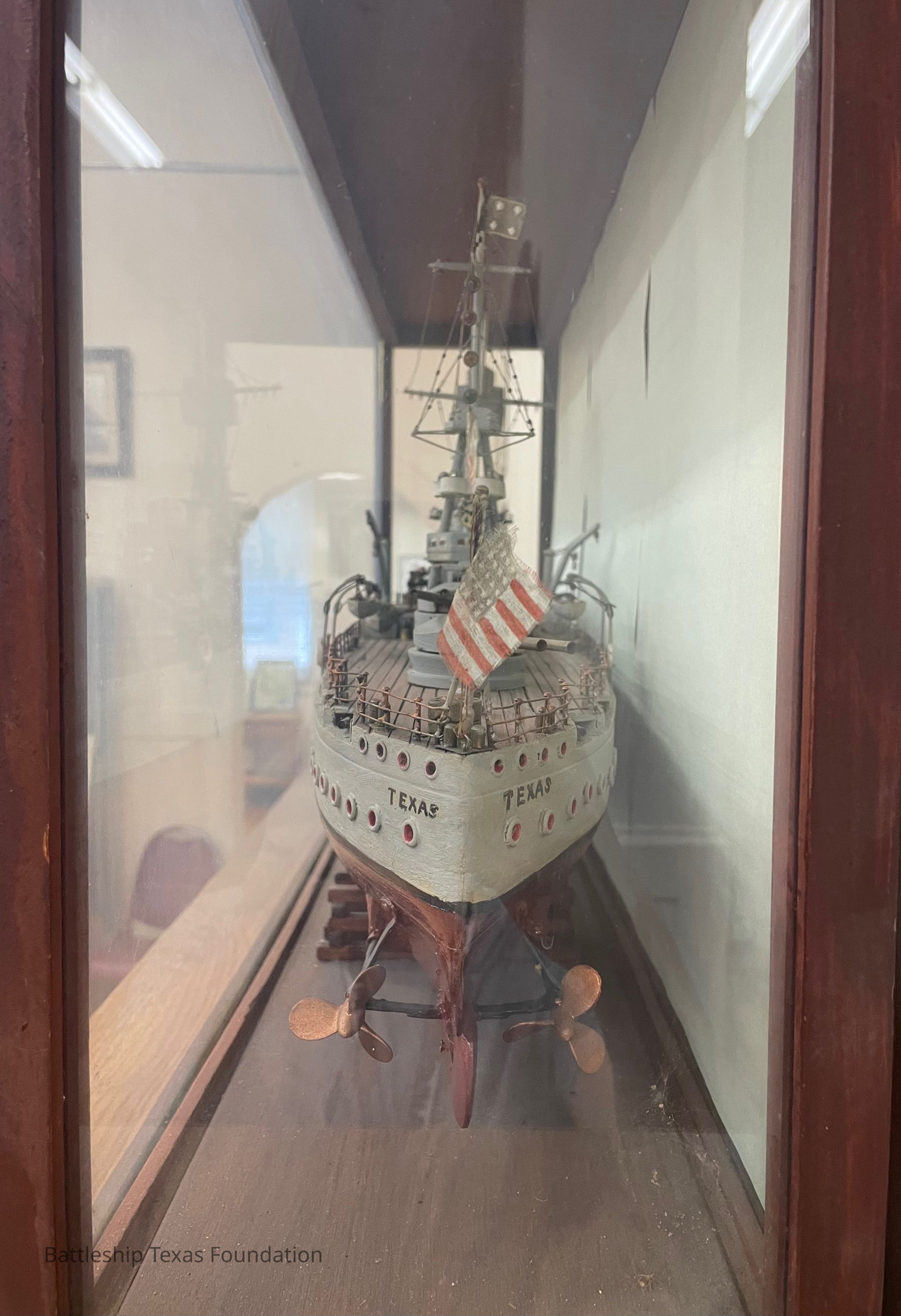 The model is inside a wood and glass case. The case has solid back and top with the front and sides being glass. The model is supported in the case by brass rods that are hidden by two stacks of wood "cribbing" -one under turret 2 and the other under turret 4 of the model. There is a half circle brass tag bearing "TEXAS" and "Ted Hawkins" in cursive.