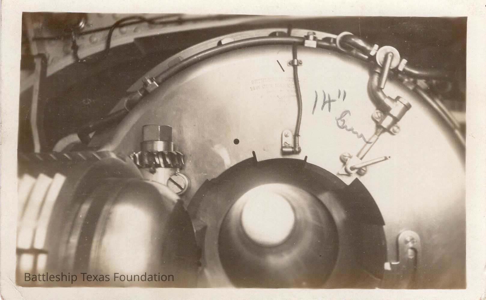 14" gun breech opened. Postcard has "14" Gun" written on it.