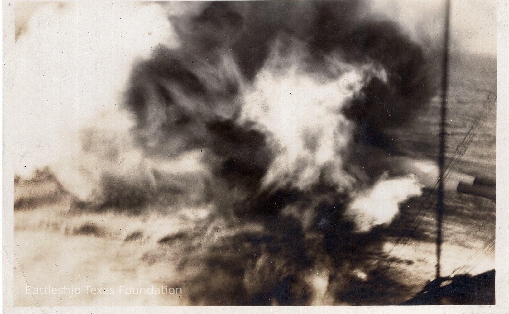Large smoke explosion out a two gun turret. Photo blurred from shockwave on initial discharge.Context