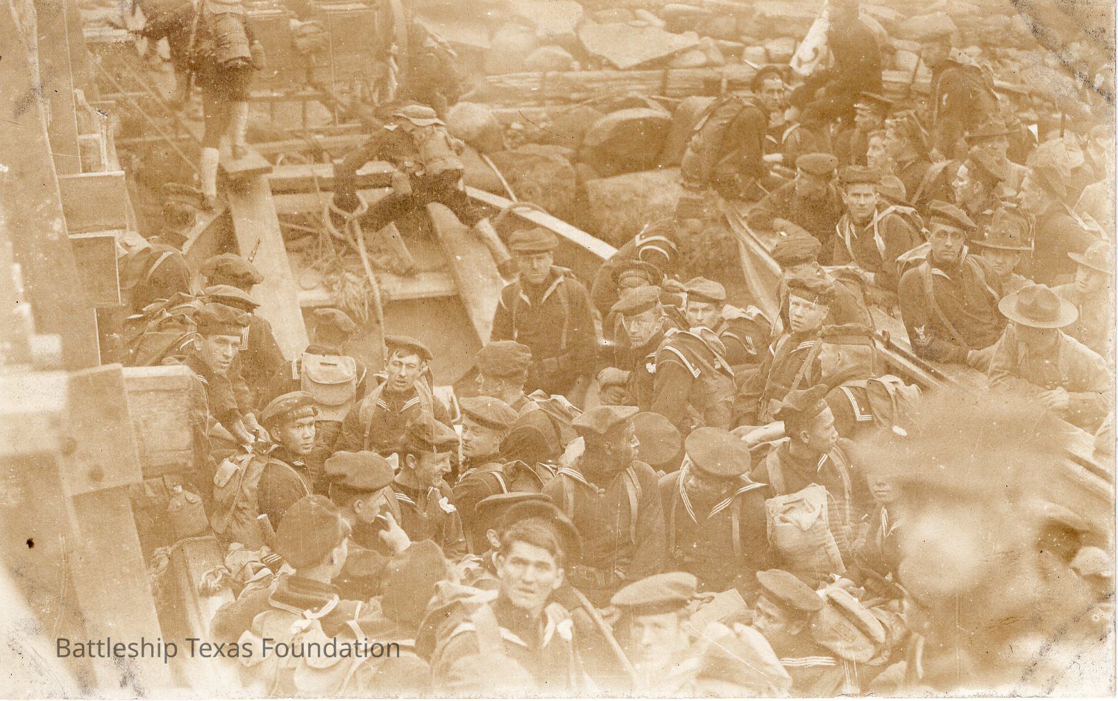 Dozens of sailors and marines. Wooden structure on the left of the photo. Man passing in front of camera in bottom right of photo is motion blurred. Back says "post card"Context