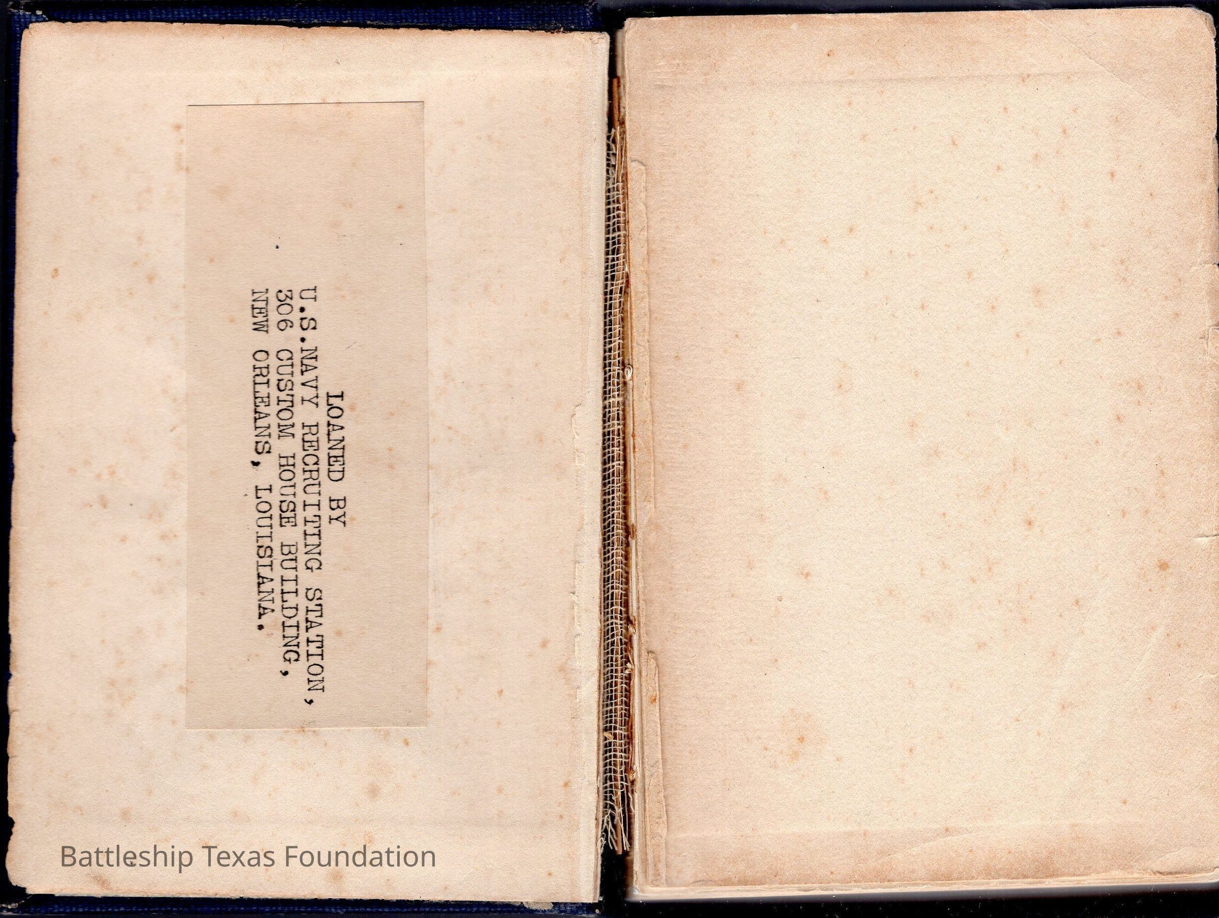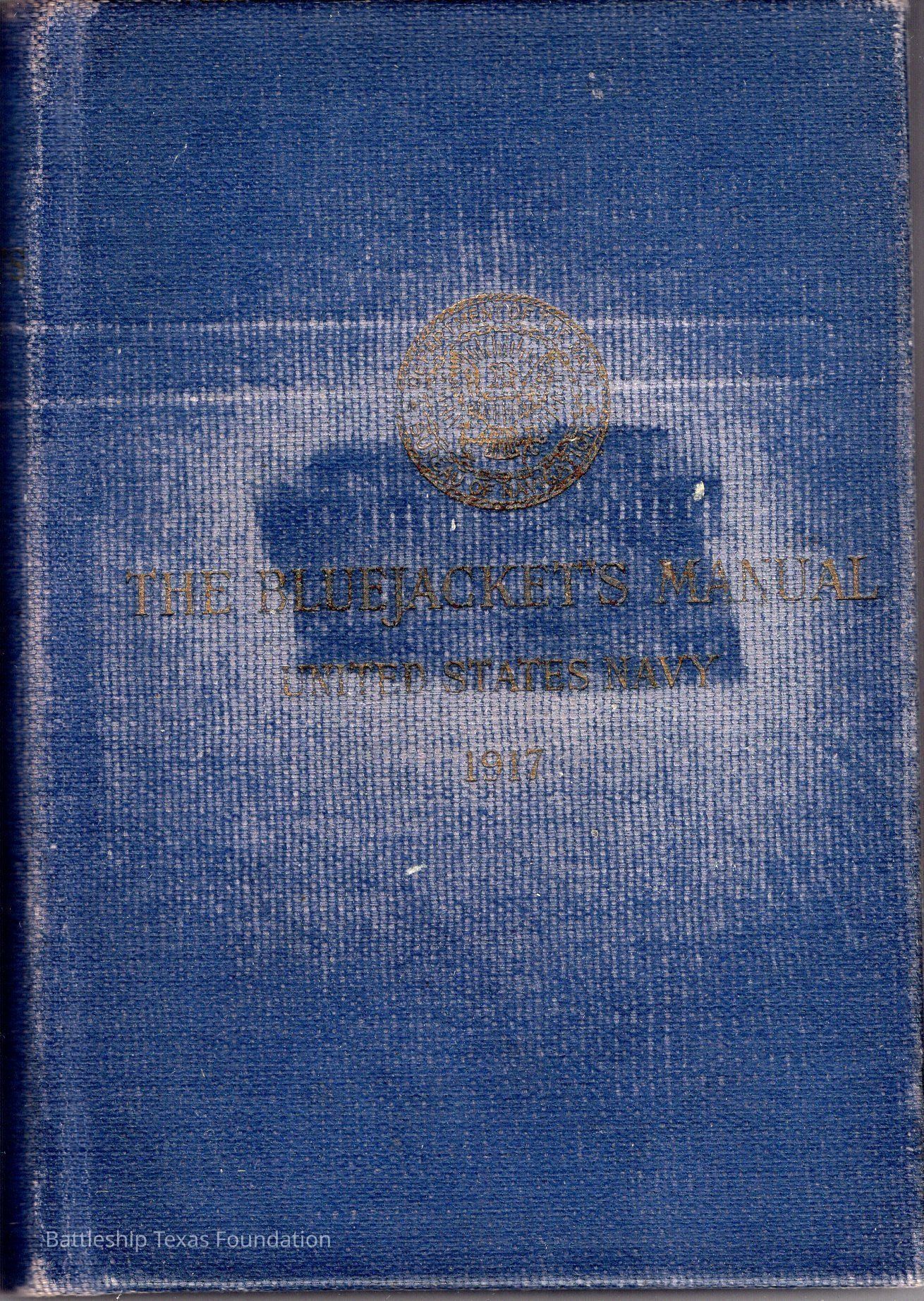 Bluejackets’ Manual has significant deterioration on the front cover, leaving a large dark spot on the center of the cover, with white faded regions on the outside. Interior pages very delicate.